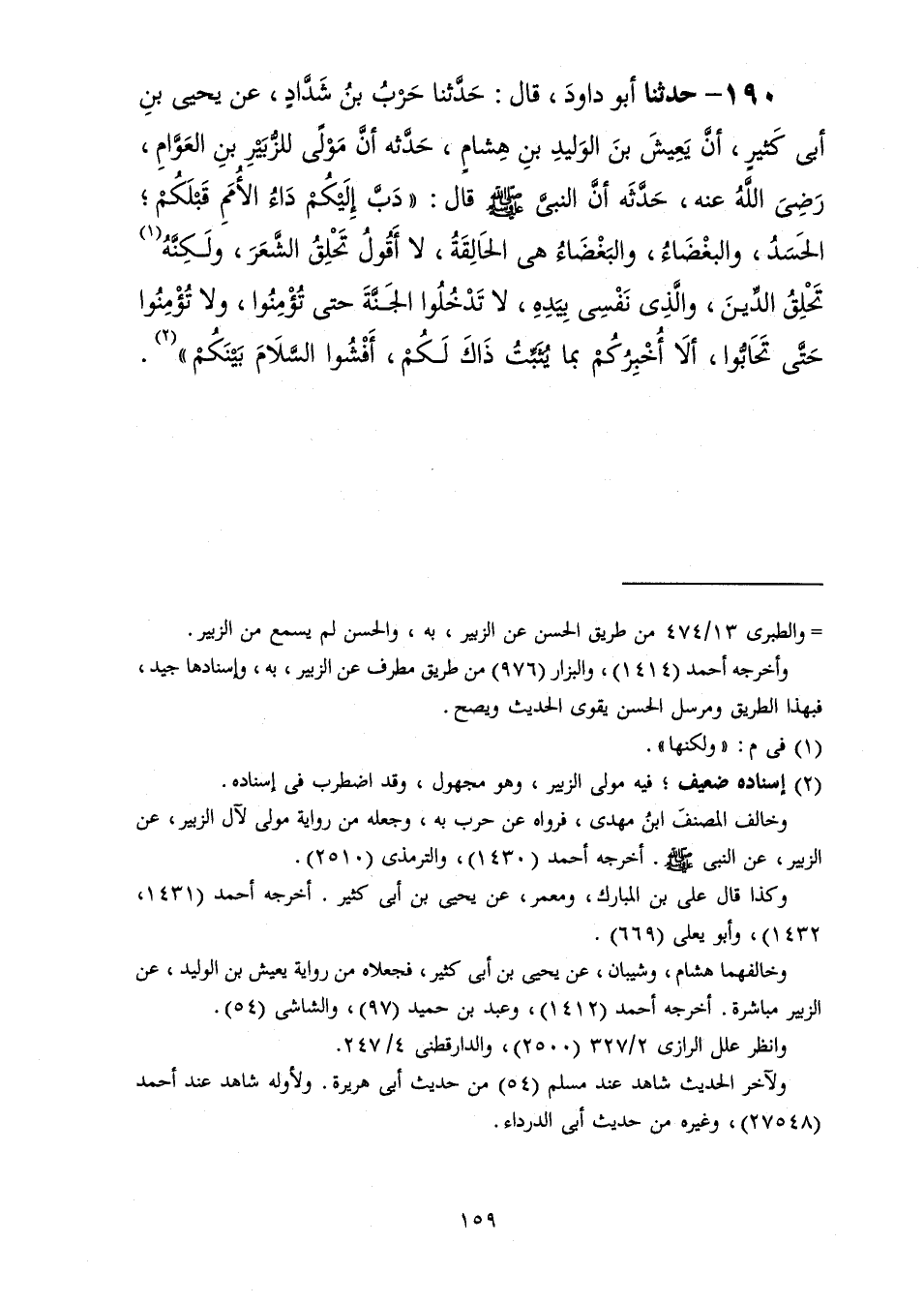 190 - حَدَّثَنَا أَبُو دَاوُدَ قَالَ: حَدَّثَنَا حَرْبُ بْنُ شَدَّادٍ، عَنْ يَحْيَى بْنِ أَبِي كَثِيرٍ، أَنَّ يَعِيشَ بْنَ الْوَلِيدِ بْنِ هِشَامٍ، حَدَّثَهُ أَنَّ مَوْلًى لِلزُّبَيْرِ بْنِ الْعَوَّامِ رَضِيَ اللَّهُ عَنْهُ حَدَّثَهُ أَنَّ النَّبِيَّ صَلَّى اللهُ عَلَيْهِ وَسَلَّمَ قَالَ: " §دَبَّ إِلَيْكُمْ دَاءُ الْأُمَمِ قَبْلَكُمُ الْحَسَدُ وَالْبَغْضَاءُ، وَالْبَغْضَاءُ هِيَ الْحَالِقَةُ لَا أَقُولُ تَحْلِقُ الشَّعْرَ وَلَكِنَّهَا تَحْلِقُ الدِّينَ وَالَّذِي نَفْسِي بِيَدِهِ لَا تَدْخُلُوا الْجَنَّةَ حَتَّى تُؤْمِنُوا وَلَا تُؤْمِنُوا حَتَّى تَحَابُّوا أَلَا أُخْبِرُكُمْ بِمَا يُثَبِّتُ ذَاكَ لَكُمْ: أَفْشُوا السَّلَامَ بَيْنَكُمْ "