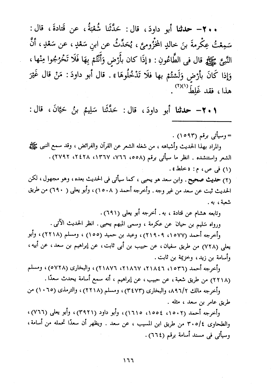 200 - حَدَّثَنَا أَبُو دَاوُدَ قَالَ: حَدَّثَنَا شُعْبَةُ، عَنْ قَتَادَةَ، قَالَ: سَمِعْتُ عِكْرِمَةَ بْنَ خَالِدٍ الْمَخْزُومِيَّ، يُحَدِّثُ عَنِ ابْنِ سَعْدٍ، عَنْ سَعْدٍ، أَنَّ النَّبِيَّ صَلَّى اللهُ عَلَيْهِ وَسَلَّمَ قَالَ فِي الطَّاعُونِ: «§إِذَا كَانَ بِأَرْضٍ وَأَنْتُمْ بِهَا فَلَا تَخْرُجُوا مِنْهَا وَإِذَا كَانَ بِأَرْضٍ وَلَسْتُمْ بِهَا فَلَا تَدْخُلُوهَا» ، قَالَ أَبُو دَاوُدَ: مَنْ قَالَ غَيْرَ هَذَا فَقَدْ غَلِطَ.