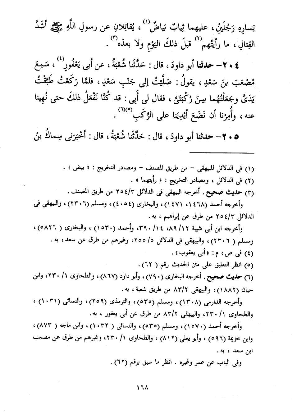 204 - حَدَّثَنَا أَبُو دَاوُدَ قَالَ: حَدَّثَنَا شُعْبَةُ، عَنْ أَبِي يَعْفُورٍ، سَمِعَ مُصْعَبَ بْنَ سَعْدٍ، يَقُولُ: صَلَّيْتُ إِلَى جَنْبِ سَعْدٍ فَلَمَّا رَكَعْتُ طَبَّقْتُ يَدَيَّ وَجَعَلْتُهُمَا بَيْنَ رُكْبَتِيَّ فَقَالَ لِي أَبِي: «قَدْ كُنَّا نَفْعَلُ ذَلِكَ حَتَّى نُهِينَا عَنْهُ §وَأُمِرْنَا أَنْ نَضَعَ أَيْدِيَنَا عَلَى الرُّكَبِ»