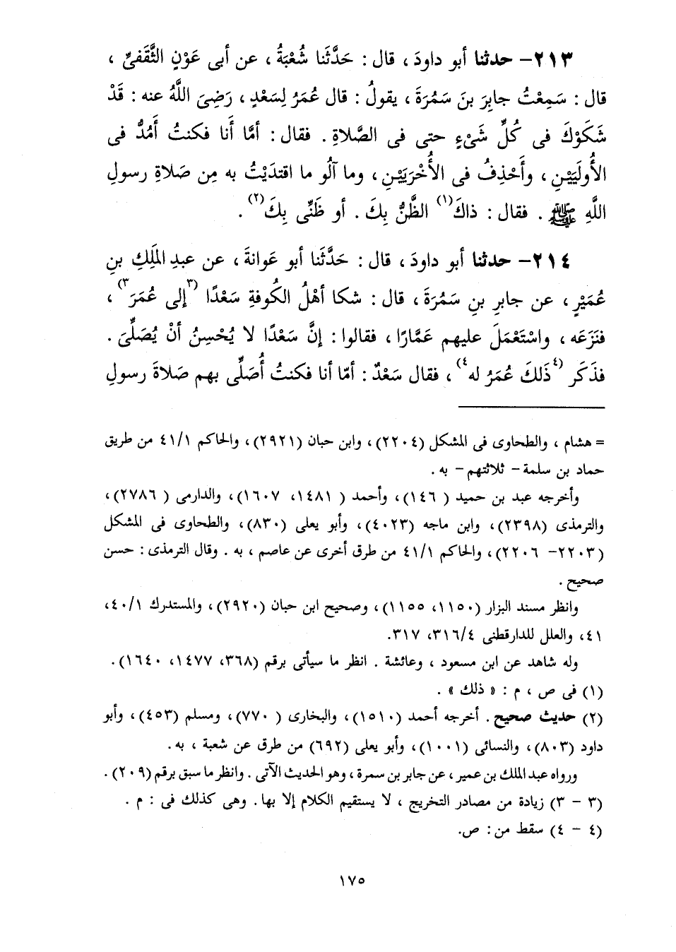 214 - حَدَّثَنَا أَبُو دَاوُدَ قَالَ: حَدَّثَنَا أَبُو عَوَانَةَ، عَنْ عَبْدِ الْمَلِكِ بْنِ عُمَيْرٍ، عَنْ جَابِرِ بْنِ سَمُرَةَ، قَالَ: شَكَا أَهْلُ الْكُوفَةِ سَعْدًا إِلَى عُمَرَ فَنَزَعَهُ وَاسْتَعْمَلَ عَلَيْهِمْ عَمَّارًا فَقَالُوا: إِنَّ سَعْدًا لَا يُحْسِنُ أَنْ يُصَلِّيَ فَذَكَرَ ذَلِكَ عُمَرُ لَهُ فَقَالَ سَعْدٌ: «أَمَّا أَنَا فَكُنْتُ أُصَلِّي بِهِمْ صَلَاةَ رَسُولِ -[176]- اللَّهِ صَلَّى اللهُ عَلَيْهِ وَسَلَّمَ وَلَا أَخْرِمُ عَنْهَا، صَلَاتَيِ الْعَشِيِّ §أَرْكُدُ فِي الْأُولَيَيْنِ وَأَحْذِفُ فِي الْأُخْرَيَيْنِ» فَقَالَ: عُمَرُ: ذَاكَ الظَّنُّ بِكَ يَا أَبَا إِسْحَاقَ