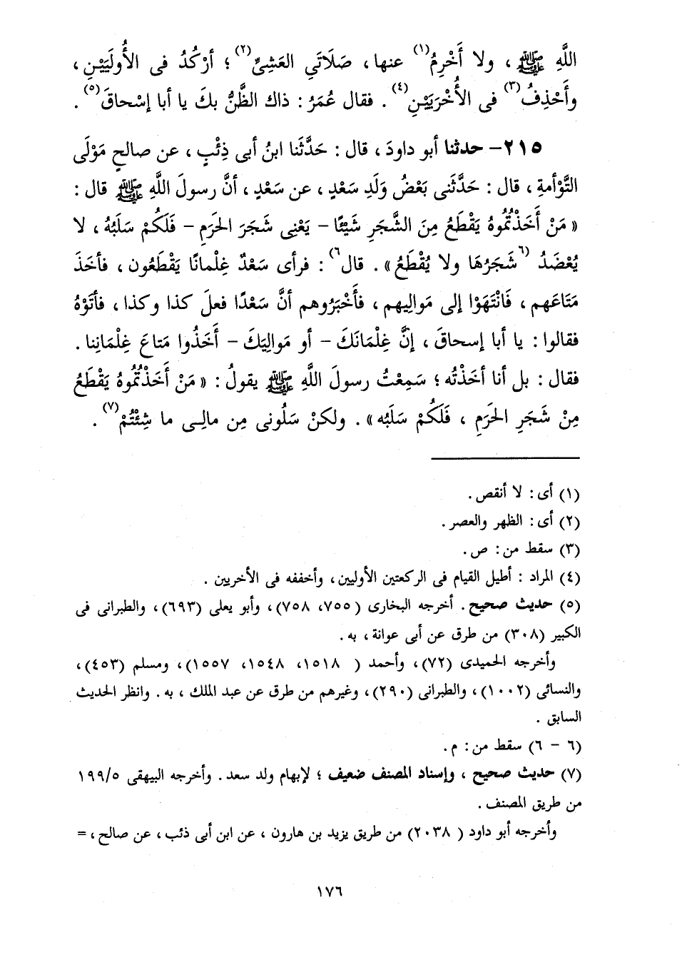 215 - حَدَّثَنَا أَبُو دَاوُدَ قَالَ: حَدَّثَنَا ابْنُ أَبِي ذِئْبٍ، عَنْ صَالِحٍ، مَوْلَى التَّوْأَمَةِ قَالَ: حَدَّثَنِي بَعْضُ وَلَدِ سَعْدٍ، عَنْ سَعْدٍ، أَنَّ رَسُولَ اللَّهِ صَلَّى اللهُ عَلَيْهِ وَسَلَّمَ قَالَ: «§مَنْ أَخَذْتُمُوهُ يَقْطَعُ مِنَ الشَّجَرِ شَيْئًا - يَعْنِي شَجَرَ الْحَرَمِ - فَلَكُمْ سَلَبُهُ لَا يُعْضَدُ شَجَرُهَا وَلَا يُقْطَعُ» قَالَ: فَرَأَى سَعْدٌ غِلْمَانًا يَقْطَعُونَ فَأَخَذَ مَتَاعَهُمْ فَانْتَهُوا إِلَى مَوَالِيهِمْ فَأَخْبَرُوهُمْ أَنَّ سَعْدًا فَعَلَ كَذَا وَكَذَا فَأَتَوْهُ فَقَالُوا: يَا أَبَا إِسْحَاقَ إِنَّ غِلْمَانَكَ أَوْ مَوَالِيكَ أَخَذُوا مَتَاعَ غِلْمَانِنَا فَقَالَ: بَلْ أَنَا أَخَذْتُهُ سَمِعْتُ رَسُولَ اللَّهِ صَلَّى اللهُ عَلَيْهِ وَسَلَّمَ يَقُولُ: «مَنْ أَخَذْتُمُوهُ يَقْطَعُ مِنْ شَجَرِ الْحَرَمِ فَلَكُمْ سَلَبُهُ» وَلَكِنْ سَلُونِي مِنْ مَالِي مَا شِئْتُمْ
