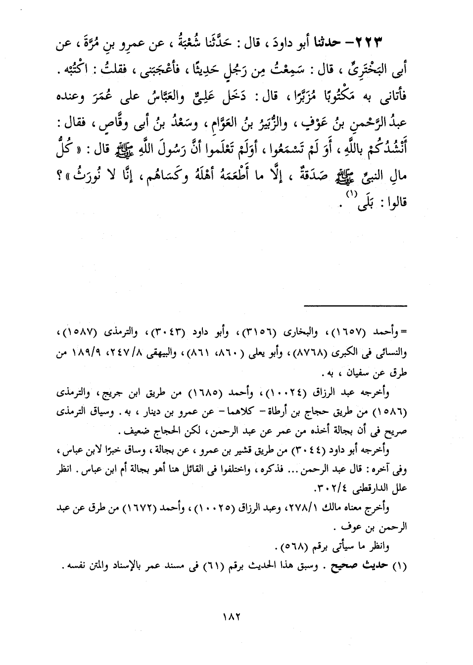 223 - حَدَّثَنَا أَبُو دَاوُدَ قَالَ: حَدَّثَنَا شُعْبَةُ، عَنْ عَمْرِو بْنِ مُرَّةَ، عَنْ أَبِي الْبَخْتَرِيِّ، قَالَ: سَمِعْتُ مِنْ رَجُلٍ حَدِيثًا فَأَعْجَبَنِي فَقُلْتُ: اكْتُبْهُ فَأَتَانِي بِهِ مَكْتُوبًا مُزَبَّرًا قَالَ: دَخَلَ عَلِيٌّ وَالْعَبَّاسُ عَلَى عُمَرَ وَعِنْدَهُ عَبْدُ الرَّحْمَنِ بْنُ عَوْفٍ، وَالزُّبَيْرُ بْنُ الْعَوَّامِ وَسَعْدُ بْنُ أَبِي وَقَّاصٍ فَقَالَ: أَنْشُدُكُمْ بِاللَّهِ أَوَلَمْ تَسْمَعُوا أَوَلَمْ تَعْلَمُوا أَنَّ رَسُولَ اللَّهِ صَلَّى اللهُ عَلَيْهِ وَسَلَّمَ قَالَ: «§كُلُّ مَالِ النَّبِيِّ صَلَّى اللهُ عَلَيْهِ وَسَلَّمَ صَدَقَةٌ إِلَّا مَا أَطْعَمَهُ أَهْلَهُ وَكَسَاهُمْ إِنَّا لَا نُورَثُ» ، قَالُوا: بَلَى
