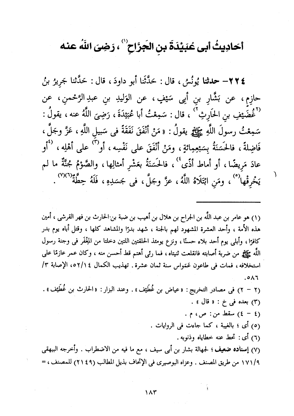 224 - حَدَّثَنَا يُونُسُ قَالَ: حَدَّثَنَا أَبُو دَاوُدَ قَالَ: حَدَّثَنَا جَرِيرُ بْنُ حَازِمٍ، عَنْ بَشَّارِ بْنِ أَبِي سَيْفٍ، عَنِ الْوَلِيدِ بْنِ عَبْدِ الرَّحْمَنِ، عَنْ غُضَيْفِ بْنِ الْحَارِثِ، قَالَ: سَمِعْتُ أَبَا عُبَيْدَةَ، رَضِيَ اللَّهُ عَنْهُ يَقُولُ: سَمِعْتُ رَسُولَ اللَّهِ صَلَّى اللهُ عَلَيْهِ وَسَلَّمَ يَقُولُ: «§مَنْ أَنْفَقَ نَفَقَةً فِي سَبِيلِ اللَّهِ عَزَّ وَجَلَّ فَاضِلَةً، فَالْحَسَنَةُ بِسَبْعِمِائَةٍ وَمَنْ أَنْفَقَ عَلَى نَفْسِهِ أَوْ عَلَى أَهْلِهِ أَوْ عَادَ مَرِيضًا أَوْ أَمَاطَ أَذًى فَالْحَسَنَةُ بِعَشْرِ أَمْثَالِهَا وَالصَّوْمُ جُنَّةٌ مَا لَمْ يَخْرِقْهَا وَمَنِ ابْتَلَاهُ اللَّهُ عَزَّ وَجَلَّ فِي جَسَدِهِ فَلَهُ حِطَّةٌ»