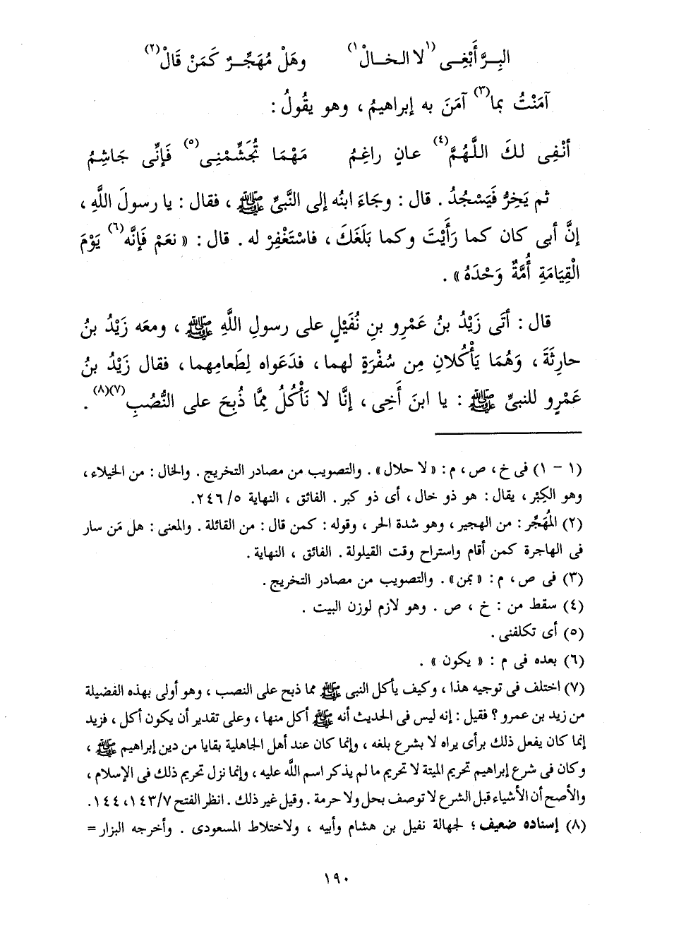 قَالَ: أَتَى زَيْدُ بْنُ عَمْرِو بْنِ نُفَيْلٍ عَلَى رَسُولِ اللهِ صَلَّى الله عَلَيْهِ وَسَلَّمَ وَمَعَهُ زَيْدُ بْنُ حَارِثَةَ وَهُمَا يَأْكُلاَنِ مِنْ سُفْرَةٍ لَهُمَا فَدَعَوَاهُ لِطَعَامِهِمَا، فَقَالَ زَيْدُ بْنُ عَمْرٍو لِلنَّبِيِّ صَلَّى الله عَلَيْهِ وَسَلَّمَ: يَا ابْنَ أَخِي إِنَّا لاَ نَأْكُلُ مِمَّا ذُبِحَ عَلَى النُّصُبِ .