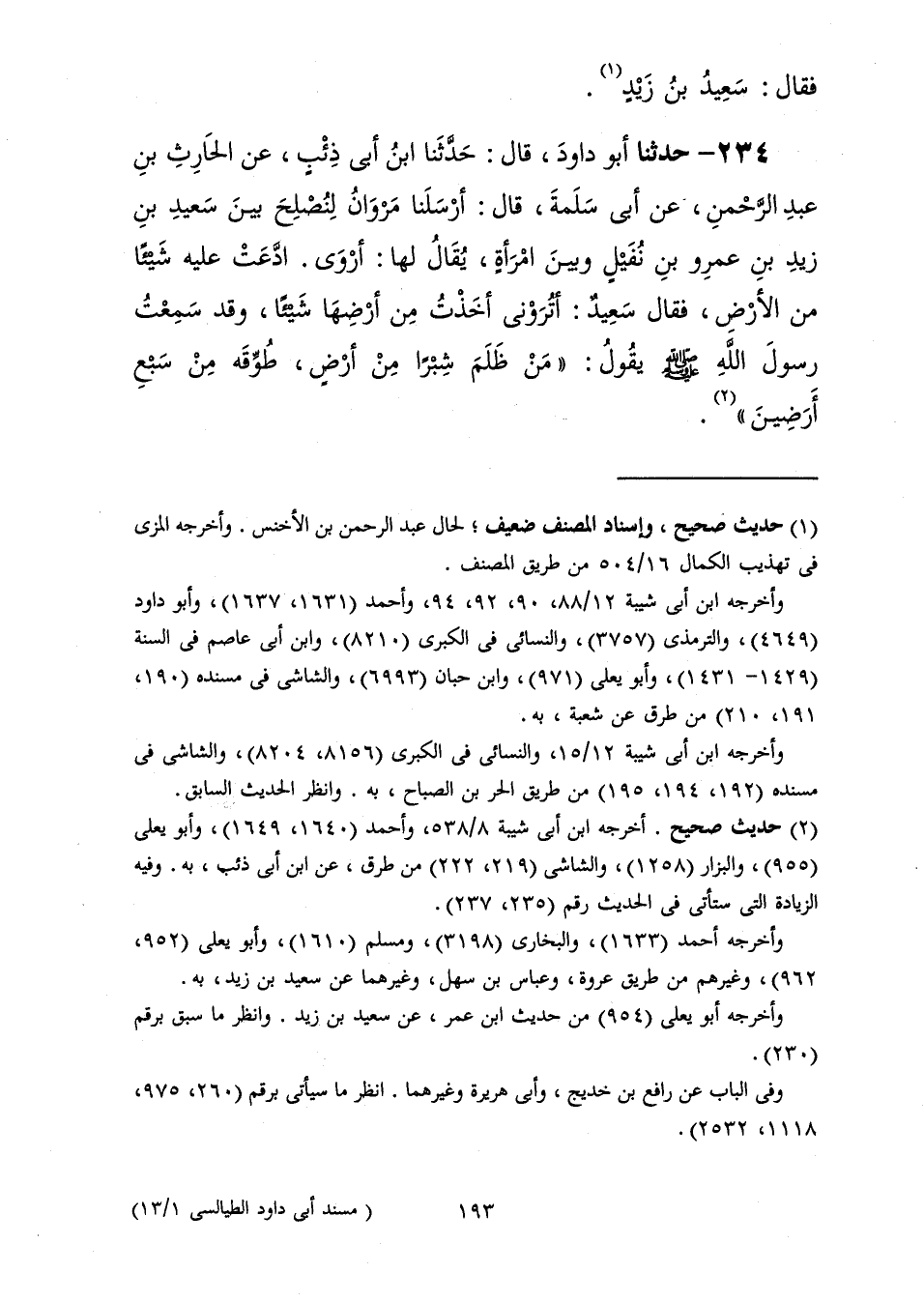234 - حَدَّثَنَا أَبُو دَاوُدَ قَالَ: حَدَّثَنَا ابْنُ أَبِي ذِئْبٍ، عَنِ الْحَارِثِ بْنِ عَبْدِ الرَّحْمَنِ، عَنْ أَبِي سَلَمَةَ، قَالَ: أَرْسَلْنَا مَرْوَانُ لِنُصْلِحَ بَيْنَ سَعِيدِ بْنِ زَيْدِ بْنِ عَمْرِو بْنِ نُفَيْلٍ وَبَيْنَ امْرَأَةٍ يُقَالُ لَهَا: أَرْوَى ادَّعَتْ عَلَيْهِ شَيْئًا مِنَ الْأَرْضِ فَقَالَ سَعِيدٌ: أَتَرَوْنِي أَخَذْتُ مِنْ أَرْضِهَا شَيْئًا وَقَدْ سَمِعْتُ رَسُولَ اللَّهِ صَلَّى اللهُ عَلَيْهِ وَسَلَّمَ يَقُولُ: «§مَنْ ظَلَمَ شِبْرًا مِنْ أَرْضٍ طُوِّقَهُ مِنْ سَبْعِ أَرَضِينَ» ؟