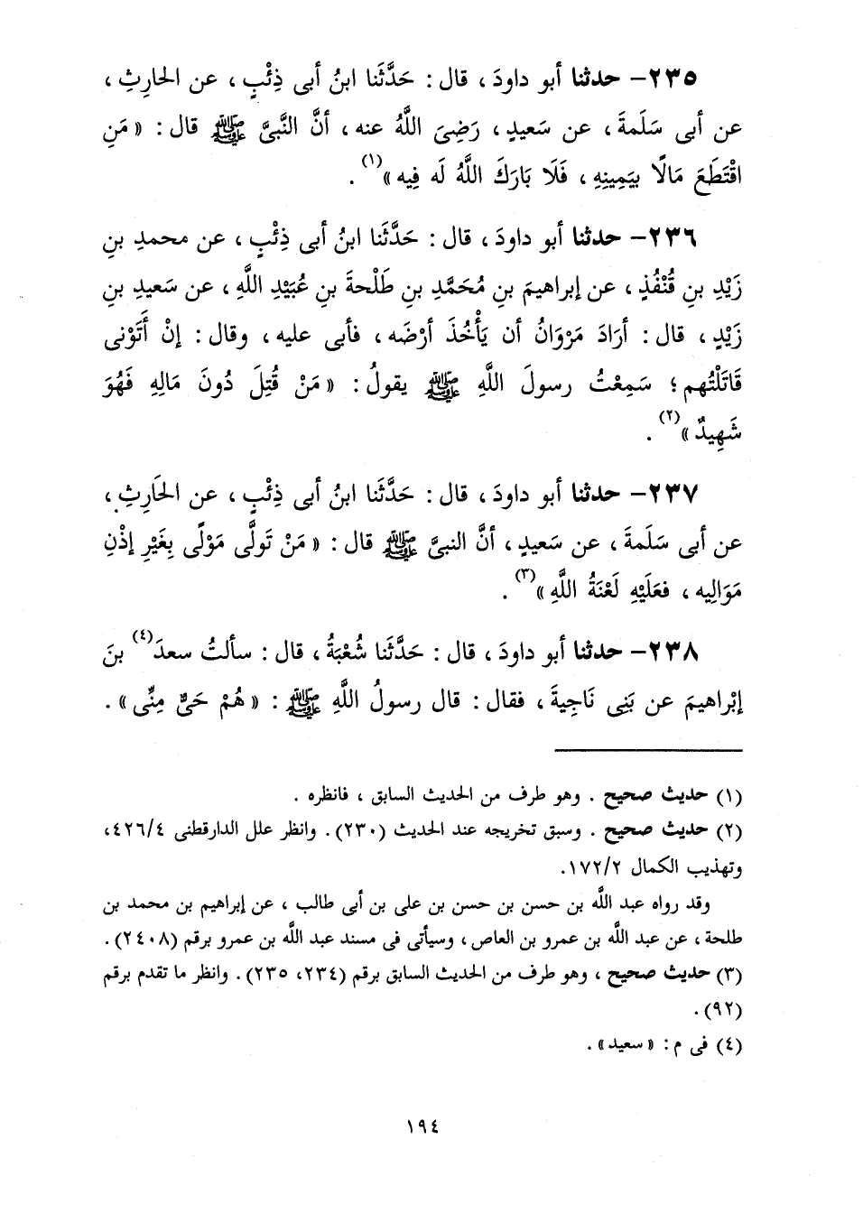 236 - حَدَّثَنَا أَبُو دَاوُدَ قَالَ: حَدَّثَنَا ابْنُ أَبِي ذِئْبٍ، عَنْ مُحَمَّدِ بْنِ زَيْدِ بْنِ قُنْفُذٍ، عَنْ إِبْرَاهِيمَ بْنِ مُحَمَّدِ بْنِ طَلْحَةَ بْنِ عُبَيْدِ اللَّهِ، عَنْ سَعِيدِ بْنِ زَيْدٍ، قَالَ: أَرَادَ مَرْوَانُ أَنْ يَأْخُذَ أَرْضَهُ فَأَبَى عَلَيْهِ وَقَالَ: إِنْ أَتَوْنِي قَاتَلْتُهُمْ؛ سَمِعْتُ رَسُولَ اللَّهِ صَلَّى اللهُ عَلَيْهِ وَسَلَّمَ يَقُولُ: «§مَنْ قُتِلَ دُونَ مَالِهِ فَهُوَ شَهِيدٌ»