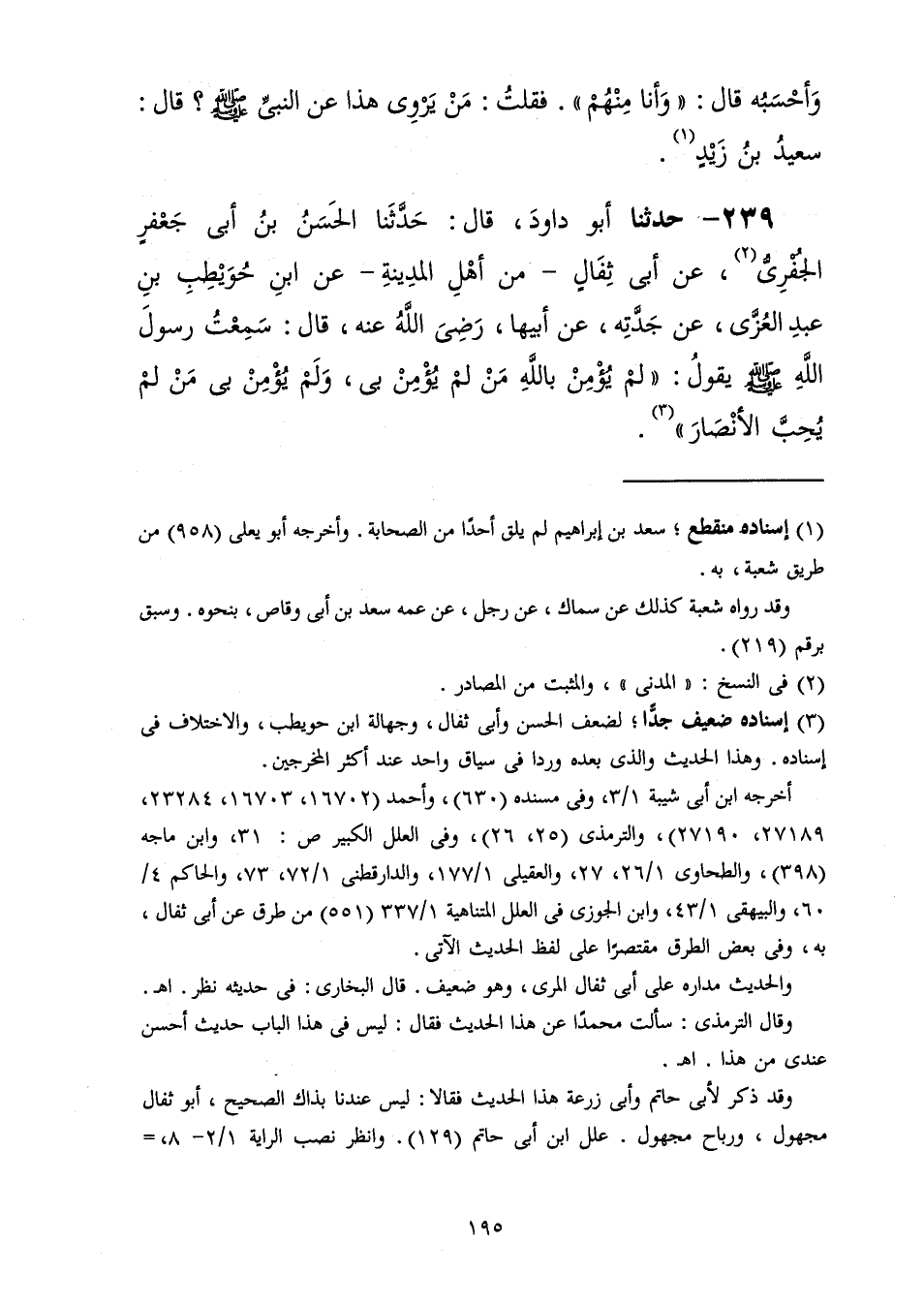 239 - حَدَّثَنَا أَبُو دَاوُدَ قَالَ: حَدَّثَنَا الْحَسَنُ بْنُ أَبِي جَعْفَرٍ الْجُفْرِيُّ، عَنْ أَبِي ثِفَالٍ مِنْ أَهْلِ الْمَدِينَةِ عَنْ أَبِي حُوَيْطِبِ بْنِ عَبْدِ الْعُزَّى، عَنْ جَدَّتِهِ، عَنْ أَبِيهَا رَضِيَ اللَّهُ عَنْهُ، قَالَ: سَمِعْتُ رَسُولَ اللَّهِ صَلَّى اللهُ عَلَيْهِ وَسَلَّمَ يَقُولُ: «§لَمْ يُؤْمِنْ بِاللَّهِ مَنْ لَمْ يُؤْمِنْ بِي، وَلَمْ يُؤْمِنْ بِي مَنْ لَمْ يُحِبَّ الْأَنْصَارَ»