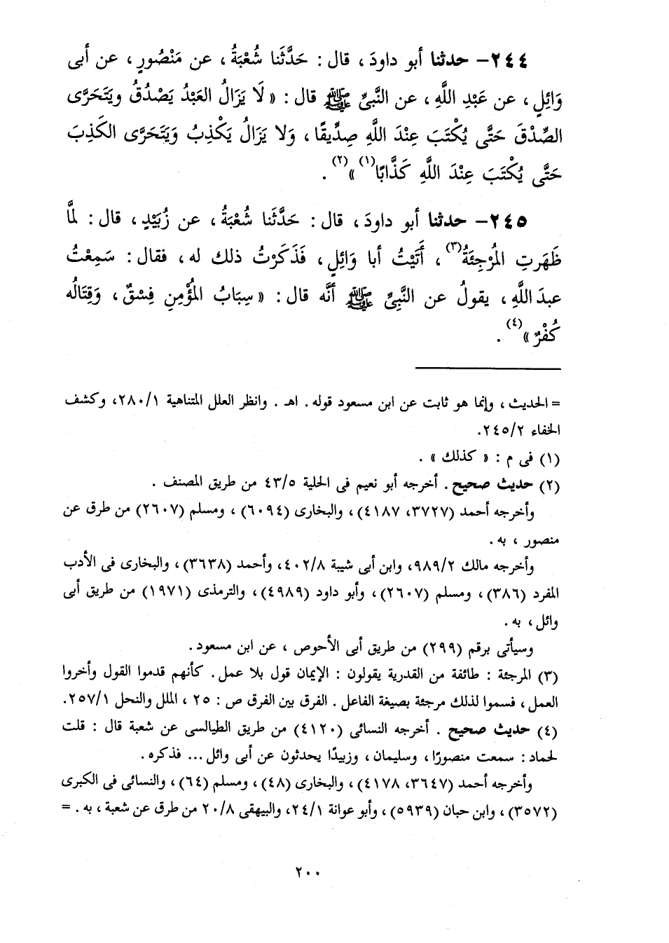 245 - حَدَّثَنَا أَبُو دَاوُدَ قَالَ: حَدَّثَنَا شُعْبَةُ، عَنْ زُبَيْدٍ، قَالَ: لَمَّا ظَهَرَتِ الْمُرْجِئَةُ أَتَيْتُ أَبَا وَائِلٍ فَذَكَرْتُ ذَلِكَ لَهُ فَقَالَ: سَمِعْتُ عَبْدَ اللَّهِ، يَقُولُ عَنِ النَّبِيِّ صَلَّى اللهُ عَلَيْهِ وَسَلَّمَ أَنَّهُ قَالَ: «§سِبَابُ الْمُؤْمِنِ فِسْقٌ وَقِتَالُهُ كُفْرٌ»