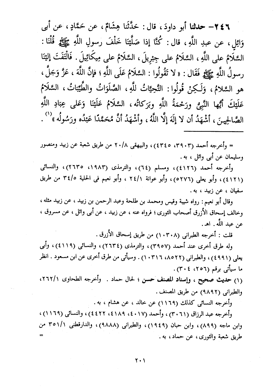 246 - حَدَّثَنَا أَبُو دَاوُدَ قَالَ: حَدَّثَنَا هِشَامٌ، عَنْ حَمَّادٍ، عَنْ أَبِي وَائِلٍ، عَنْ عَبْدِ اللَّهِ، قَالَ: كُنَّا إِذَا صَلَّيْنَا خَلْفَ رَسُولِ اللَّهِ صَلَّى اللهُ عَلَيْهِ وَسَلَّمَ قُلْنَا: السَّلَامُ عَلَى اللَّهِ السَّلَامُ عَلَى جِبْرِيلَ السَّلَامُ عَلَى مِيكَائِيلَ فَالْتَفَتَ إِلَيْنَا رَسُولُ اللَّهِ صَلَّى اللهُ عَلَيْهِ وَسَلَّمَ فَقَالَ: " لَا تَقُولُوا السَّلَامَ عَلَى اللَّهِ فَإِنَّ اللَّهَ عَزَّ وَجَلَّ هُوَ السَّلَامُ وَلَكِنْ قُولُوا: §التَّحِيَّاتُ لِلَّهِ وَالصَّلَوَاتُ وَالطَّيِّبَاتُ السَّلَامُ، عَلَيْكَ أَيُّهَا النَّبِيُّ وَرَحْمَةُ اللَّهِ وَبَرَكَاتُهُ، السَّلَامُ عَلَيْنَا وَعَلَى عِبَادِ اللَّهِ الصَّالِحِينَ، أَشْهَدُ أَنْ لَا إِلَهَ إِلَّا اللَّهُ وَأَشْهَدُ أَنَّ مُحَمَّدًا عَبْدُهُ وَرَسُولُهُ "