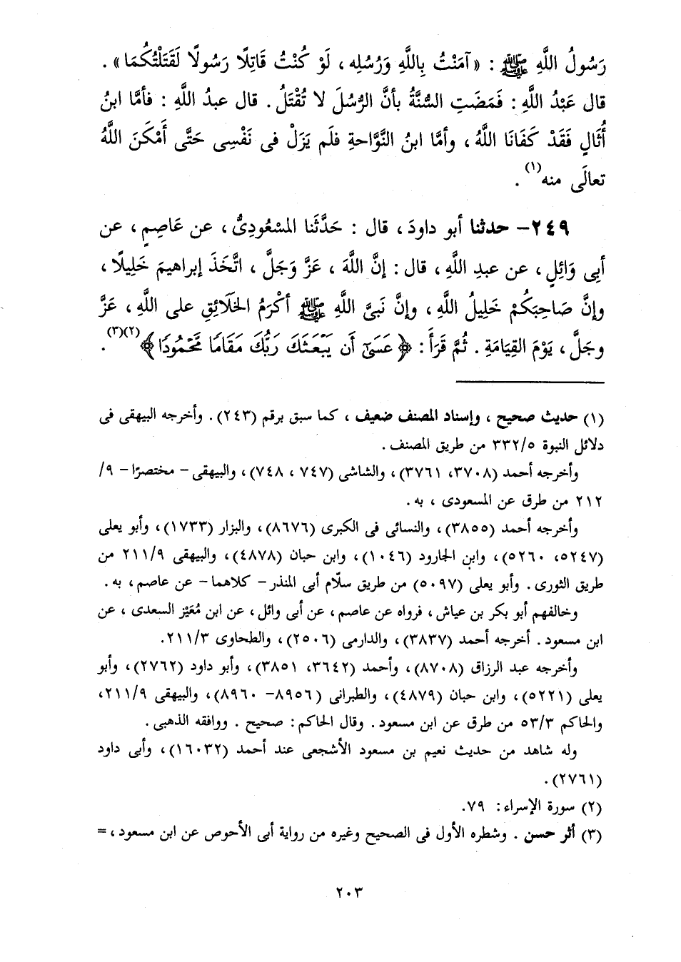 249 - حَدَّثَنَا أَبُو دَاوُدَ قَالَ: حَدَّثَنَا الْمَسْعُودِيُّ، عَنْ عَاصِمٍ، عَنْ أَبِي وَائِلٍ، عَنْ عَبْدِ اللَّهِ، قَالَ: " إِنَّ §اللَّهَ عَزَّ وَجَلَّ اتَّخَذَ إِبْرَاهِيمَ خَلِيلًا وَإِنَّ صَاحِبَكُمْ خَلِيلُ اللَّهِ وَإِنَّ نَبِيَّ اللَّهِ صَلَّى اللهُ عَلَيْهِ وَسَلَّمَ أَكْرَمُ الْخَلَائِقَ عَلَى اللَّهِ عَزَّ وَجَلَّ يَوْمَ الْقِيَامَةِ ثُمَّ قَرَأَ {عَسَى أَنْ يَبْعَثَكَ رَبُّكَ مَقَامًا مَحْمُودًا} [الإسراء: 79] "