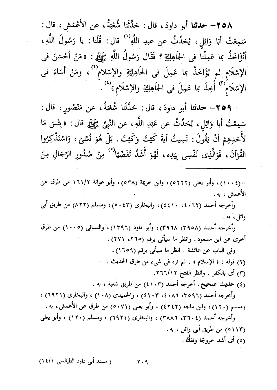 258 - حَدَّثَنَا أَبُو دَاوُدَ قَالَ: حَدَّثَنَا شُعْبَةُ، عَنِ الْأَعْمَشِ قَالَ سَمِعْتُ أَبَا وَائِلٍ، يُحَدِّثُ عَنْ عَبْدِ اللَّهِ، قَالَ: قُلْنَا: يَا رَسُولَ اللَّهِ أَنُؤَاخَذُ بِمَا عَمِلْنَا فِي الْجَاهِلِيَّةِ فَقَالَ رَسُولُ اللَّهِ صَلَّى اللهُ عَلَيْهِ وَسَلَّمَ: «§مَنْ أَحْسَنَ فِي الْإِسْلَامِ لَمْ يُؤَاخَذْ بِمَا عَمِلَ فِي الْجَاهِلِيَّةِ وَالْإِسْلَامِ، وَمَنْ أَسَاءَ فِي الْإِسْلَامِ أُخِذَ بِمَا عَمِلَ فِي الْجَاهِلِيَّةِ وَالْإِسْلَامِ»