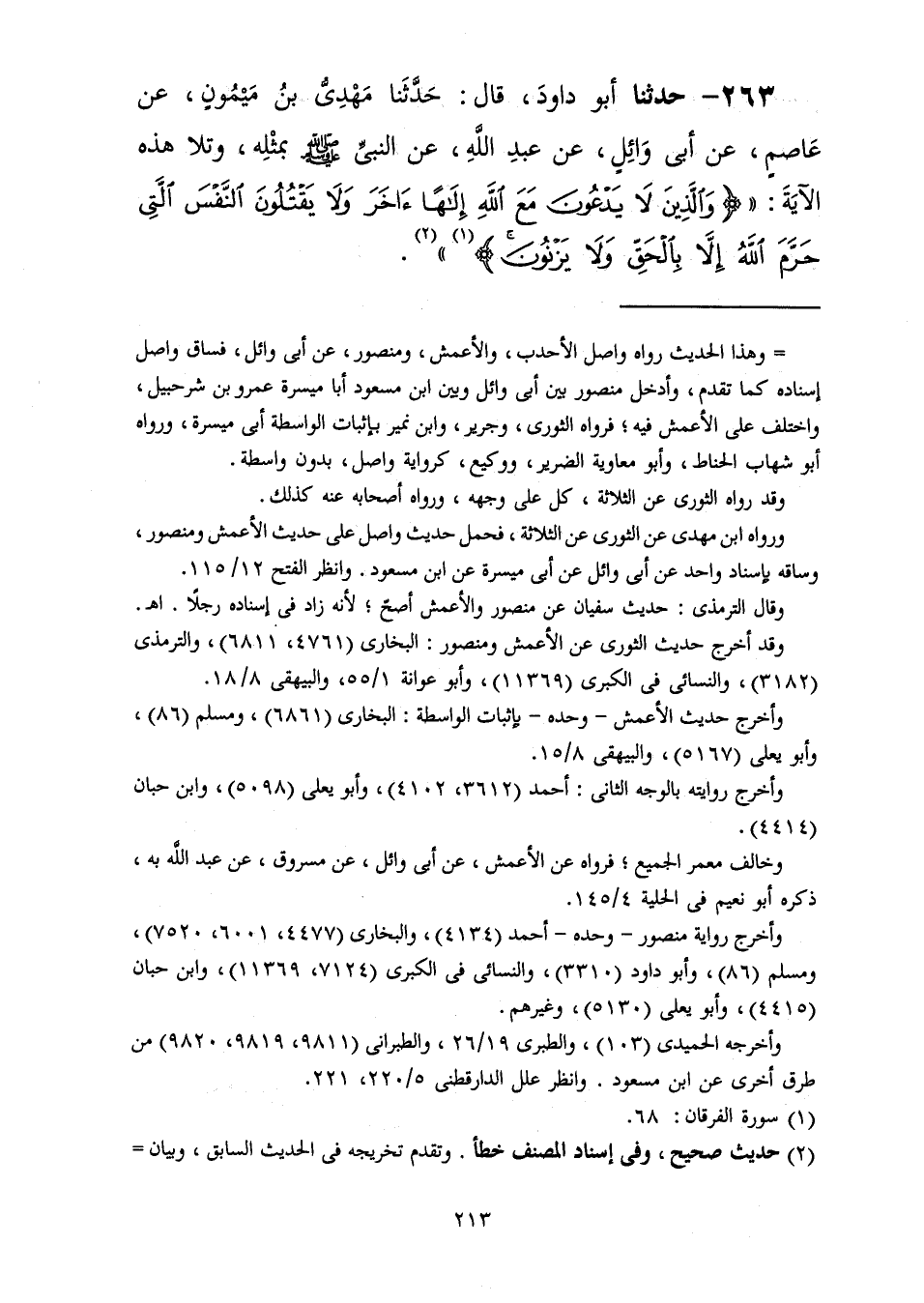 263- حَدَّثَنَا مَهْدِيُّ بْنُ مَيْمُونٍ، عَنْ عَاصِمٍ، عَنْ أَبِي وَائِلٍ، عَنْ عَبْدِ اللهِ، عَنِ النَّبِيِّ صَلَّى الله عَلَيْهِ وَسَلَّمَ، بِمِثْلِهِ، وَتَلاَ هَذِهِ الآيَةَ: {وَالَّذِينَ لاَ يَدْعُونَ مَعَ اللهِ إِلَهًا آخَرَ وَلاَ يَقْتُلُونَ النَّفْسَ الَّتِي حَرَّمَ اللهُ إِلاَّ بِالْحَقِّ وَلاَ يَزْنُونَ}.