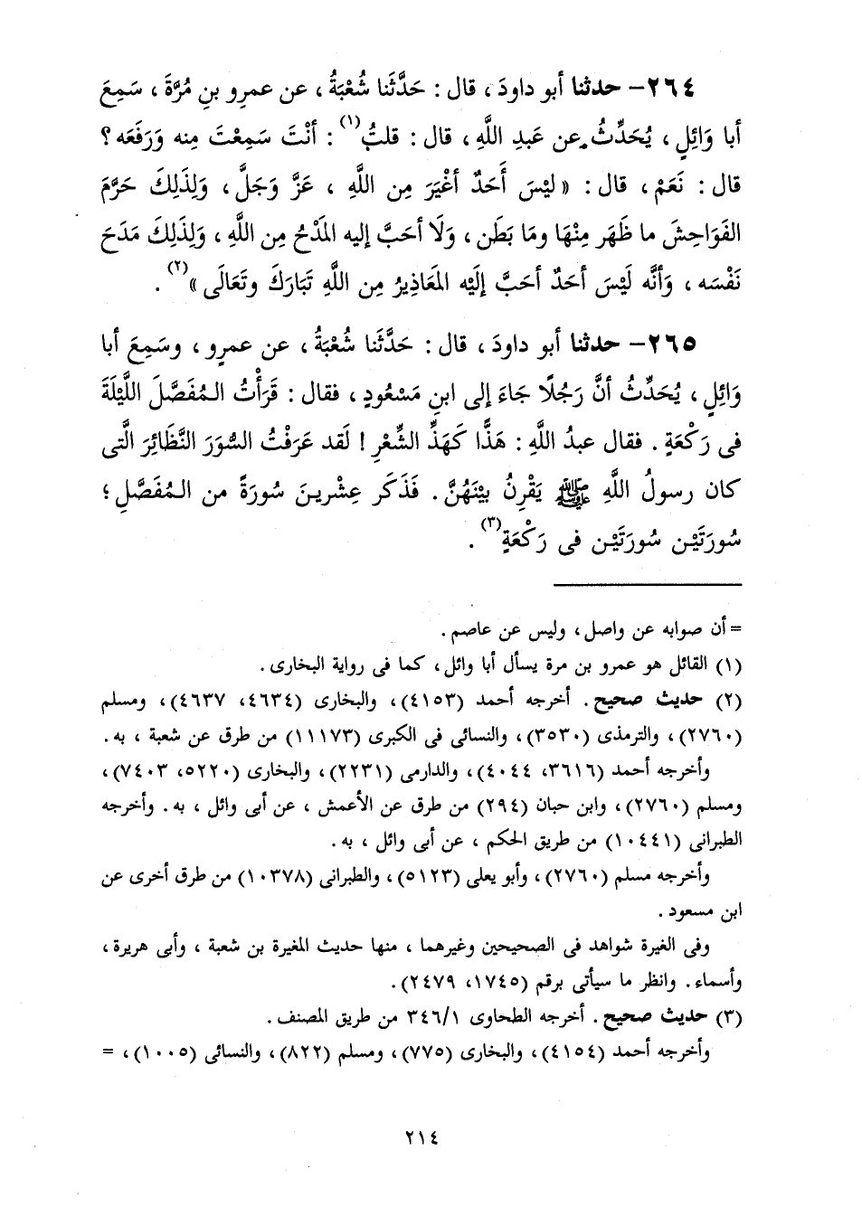 265 - حَدَّثَنَا أَبُو دَاوُدَ قَالَ: حَدَّثَنَا شُعْبَةُ، عَنْ عَمْرٍو، وَسَمِعَ أَبَا وَائِلٍ، يُحَدِّثُ أَنَّ رَجُلًا جَاءَ إِلَى ابْنِ مَسْعُودٍ فَقَالَ: قَرَأْتُ الْمُفَصَّلَ اللَّيْلَةَ فِي رَكْعَةٍ فَقَالَ عَبْدُ اللَّهِ: «هَذَا كَهَذِّ الشِّعْرِ لَقَدْ عَرَفْتُ §السُّوَرَ النَّظَائِرَ الَّتِي كَانَ رَسُولُ اللَّهِ صَلَّى اللهُ عَلَيْهِ وَسَلَّمَ يَقْرِنُ بَيْنَهُنَّ فَذَكَرَ» عِشْرِينَ سُورَةً مِنَ الْمُفَصَّلِ سُورَتَيْنِ سُورَتَيْنِ فِي رَكْعَةٍ "