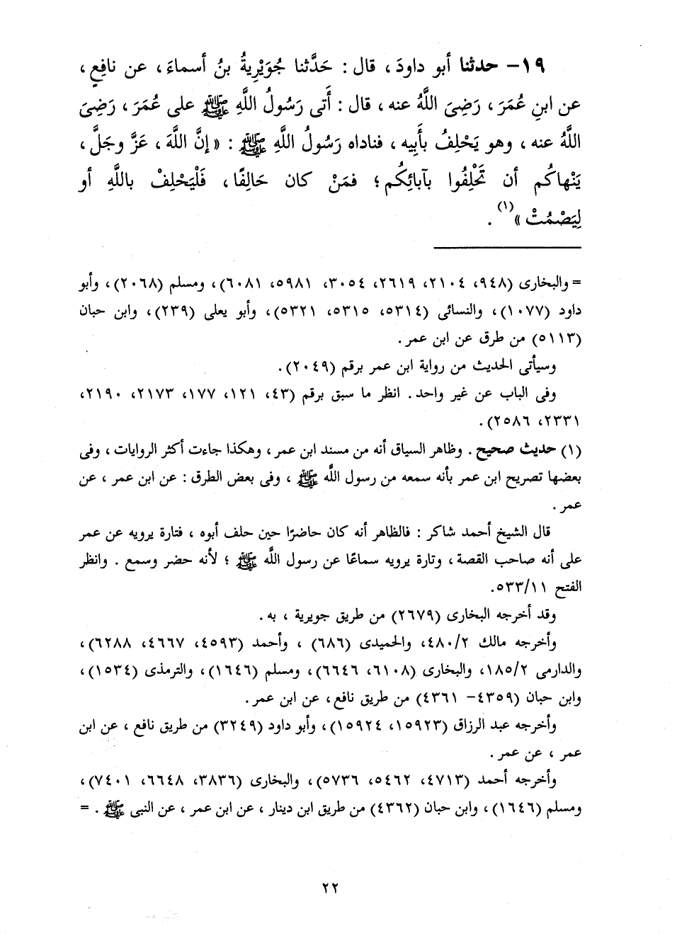 19 - حَدَّثَنَا أَبُو دَاوُدَ قَالَ: حَدَّثَنَا جُوَيْرِيَةُ بْنُ أَسْمَاءَ، عَنْ نَافِعٍ، عَنِ ابْنِ عُمَرَ رَضِيَ اللَّهُ عَنْهُ، قَالَ: أَتَى رَسُولُ اللَّهِ صَلَّى اللهُ عَلَيْهِ وَسَلَّمَ عَلَى عُمَرَ رَضِيَ اللَّهُ عَنْهُ وَهُوَ يَحْلِفُ بِأَبِيهِ فَنَادَاهُ رَسُولُ اللَّهِ صَلَّى اللهُ عَلَيْهِ وَسَلَّمَ: «إِنَّ اللَّهَ عَزَّ وَجَلَّ §يَنْهَاكُمْ أَنْ تَحْلِفُوا بِآبَائِكُمْ، فَمَنْ كَانَ حَالِفًا فَلْيَحْلِفْ بِاللَّهِ أَوْ لِيَصْمُتْ»