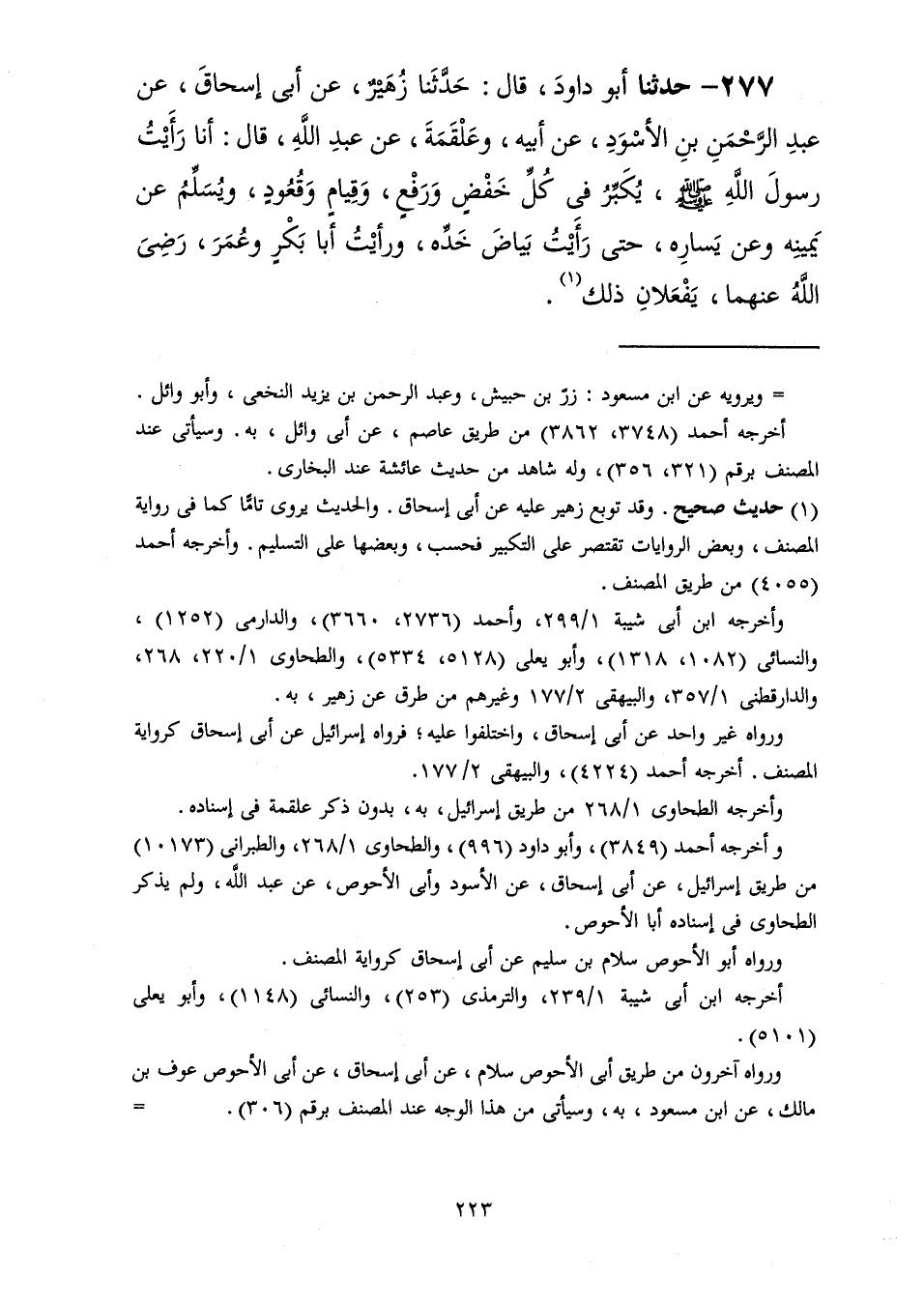 277 - حَدَّثَنَا أَبُو دَاوُدَ قَالَ: حَدَّثَنَا زُهَيْرٌ، عَنْ أَبِي إِسْحَاقَ، عَنْ عَبْدِ الرَّحْمَنِ بْنِ الْأَسْوَدِ، عَنْ أَبِيهِ، وَعَلْقَمَةَ، عَنْ عَبْدِ اللَّهِ، قَالَ: «أَنَا رَأَيْتُ رَسُولَ اللَّهِ صَلَّى اللهُ عَلَيْهِ وَسَلَّمَ §يُكَبِّرُ فِي كُلِّ خَفْضٍ وَرَفْعٍ وَقِيَامٍ وَقُعُودٍ وَيُسَلِّمُ عَنْ يَمِينِهِ وَعَنْ يَسَارِهِ حَتَّى رَأَيْتُ بَيَاضَ خَدِّهِ» ، وَرَأَيْتُ أَبَا بَكْرٍ وَعُمَرَ رَضِيَ اللَّهُ عَنْهُمَا يَفْعَلَانِ ذَلِكَ
