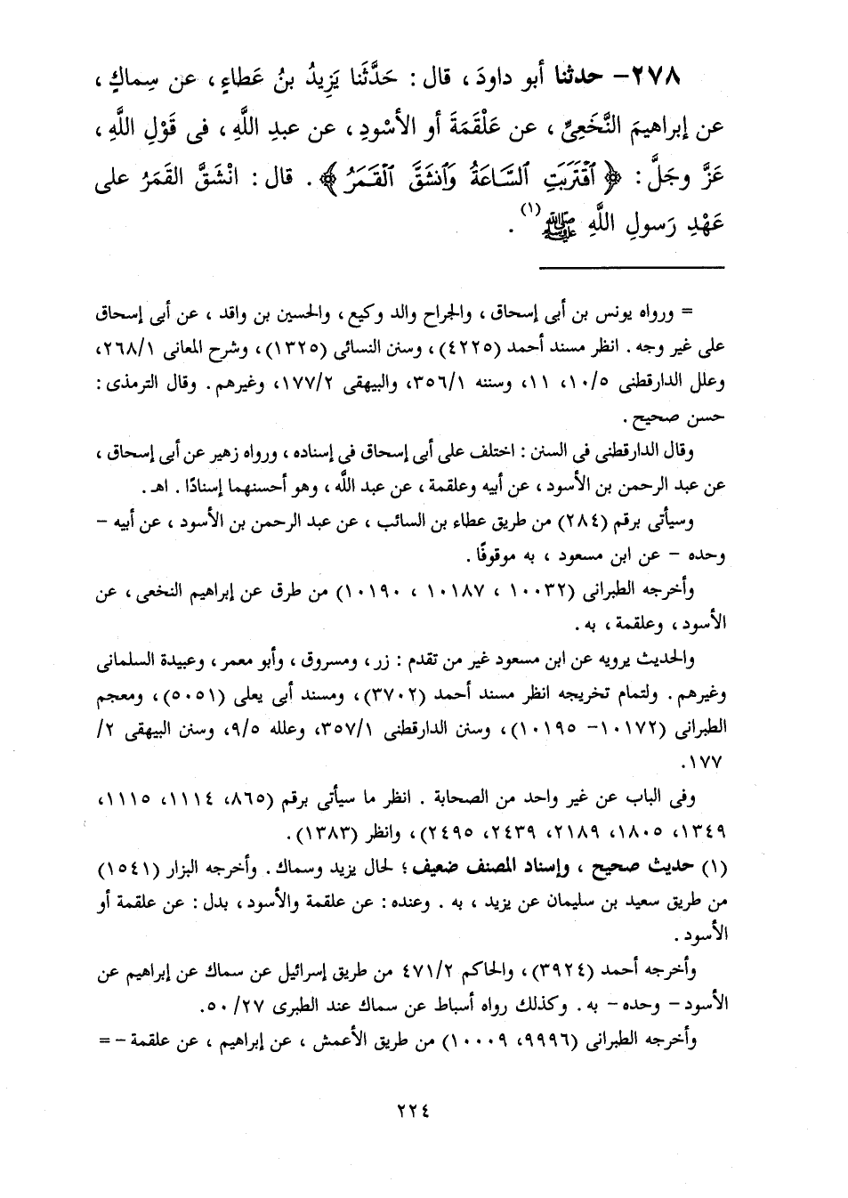278 - حَدَّثَنَا أَبُو دَاوُدَ قَالَ: حَدَّثَنَا يَزِيدُ بْنُ عَطَاءٍ، عَنْ سِمَاكٍ، عَنْ إِبْرَاهِيمَ النَّخَعِيِّ، عَنْ عَلْقَمَةَ أَوِ الْأَسْوَدِ، عَنْ عَبْدِ اللَّهِ، فِي قَوْلِ اللَّهِ عَزَّ وَجَلَّ {اقْتَرَبَتِ السَّاعَةُ وَانْشَقَّ الْقَمَرُ} [القمر: 1] قَالَ: «§انْشَقَّ الْقَمَرُ عَلَى عَهْدِ رَسُولِ اللَّهِ صَلَّى اللهُ عَلَيْهِ وَسَلَّمَ»