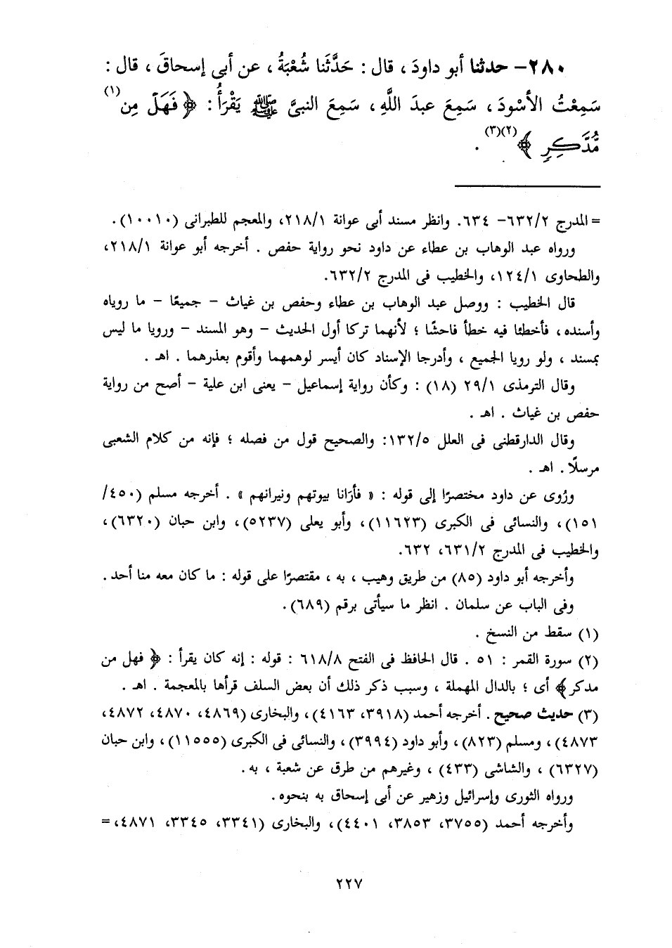 280 - حَدَّثَنَا أَبُو دَاوُدَ قَالَ: حَدَّثَنَا شُعْبَةُ، عَنْ أَبِي إِسْحَاقَ، قَالَ: سَمِعْتُ الْأَسْوَدَ، سَمِعَ عَبْدَ اللَّهِ، " سَمِعَ النَّبِيَّ صَلَّى اللهُ عَلَيْهِ وَسَلَّمَ §يَقْرَأُ {فَهَلْ مِنْ مُدَّكِرٍ} -[228]-[القمر: 15] "