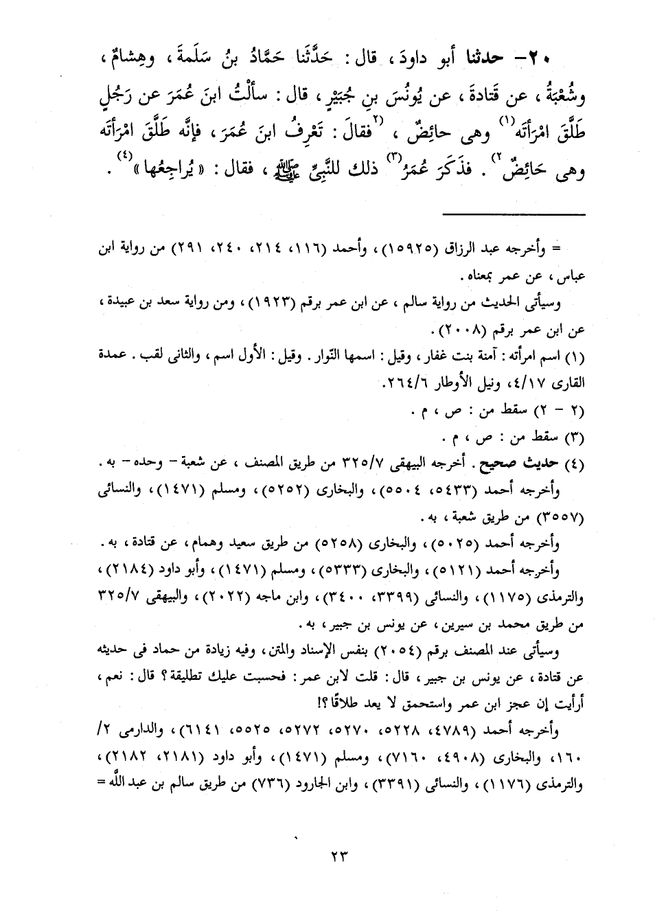 20 - حَدَّثَنَا أَبُو دَاوُدَ قَالَ: حَدَّثَنَا حَمَّادُ بْنُ سَلَمَةَ، وَهِشَامٌ، وَشُعْبَةُ، عَنْ قَتَادَةَ، عَنْ يُونُسَ بْنِ جُبَيْرٍ، قَالَ: سَأَلْتُ ابْنَ عُمَرَ عَنْ رَجُلٍ §طَلَّقَ امْرَأَتَهُ وَهِيَ حَائِضٌ فَقَالَ: تَعْرِفُ ابْنَ عُمَرَ فَإِنَّهُ طَلَّقَ امْرَأَتَهُ وَهِيَ حَائِضٌ، فَذَكَرَ عُمَرُ ذَلِكَ لِلنَّبِيِّ صَلَّى اللهُ عَلَيْهِ وَسَلَّمَ فَقَالَ: «يُرَاجِعُهَا»