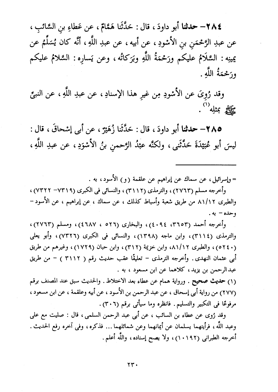 284 - حَدَّثَنَا أَبُو دَاوُدَ قَالَ: حَدَّثَنَا هَمَّامٌ، عَنْ عَطَاءِ بْنِ السَّائِبِ، عَنْ عَبْدِ الرَّحْمَنِ بْنِ الْأَسْوَدِ، عَنْ أَبِيهِ، عَنْ عَبْدِ اللَّهِ، " أَنَّهُ كَانَ §يُسَلِّمُ عَنْ يَمِينِهِ: «السَّلَامُ عَلَيْكُمْ وَرَحْمَةُ اللَّهِ وَبَرَكَاتُهُ» ، وَعَنْ يَسَارِهِ: «السَّلَامُ عَلَيْكُمْ وَرَحْمَةُ اللَّهِ» وَقَدْ رُوِيَ عَنِ الْأَسْوَدِ مِنْ غَيْرِ هَذَا الْإِسْنَادِ عَنْ عَبْدِ اللَّهِ، عَنِ النَّبِيِّ صَلَّى اللهُ عَلَيْهِ وَسَلَّمَ بِمِثْلِهِ