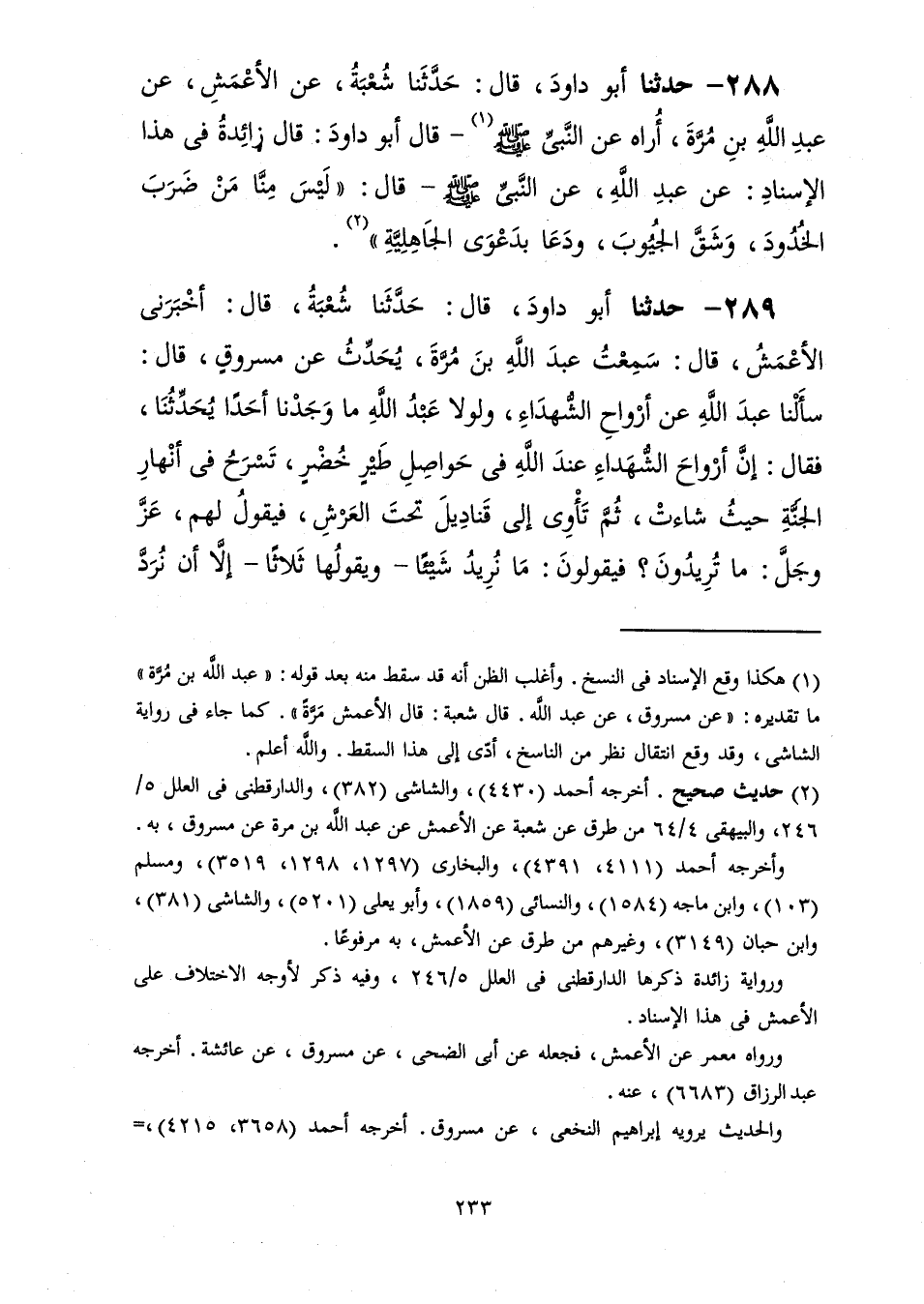 289 - حَدَّثَنَا أَبُو دَاوُدَ قَالَ: حَدَّثَنَا شُعْبَةُ، قَالَ: أَخْبَرَنِي الْأَعْمَشُ، قَالَ: سَمِعْتُ عَبْدَ اللَّهِ بْنَ مُرَّةَ، يُحَدِّثُ عَنْ مَسْرُوقٍ، قَالَ: سَأَلْنَا عَبْدَ اللَّهِ عَنْ أَرْوَاحِ الشُّهَدَاءِ وَلَوْلَا عَبْدُ اللَّهِ مَا وَجَدْنَا أَحَدًا يُحَدِّثُنَا فَقَالَ: " إِنَّ §أَرْوَاحَ الشُّهَدَاءِ عِنْدَ اللَّهِ فِي حَوَاصِلِ طَيْرٍ خُضْرٍ تَسْرَحُ فِي أَنْهَارِ الْجَنَّةِ حَيْثُ شَاءَتْ ثُمَّ تَأْوِي إِلَى قَنَادِيلَ تَحْتَ الْعَرْشِ فَيَقُولُ لَهُمْ عَزَّ وَجَلَّ: مَا تُرِيدُونَ؟ فَيَقُولُونَ: مَا نُرِيدُ شَيْئًا، وَيَقُولُهَا ثَلَاثًا، إِلَّا أَنْ نُرَدَّ -[234]- إِلَى الدُّنْيَا فَنُقْتَلَ "