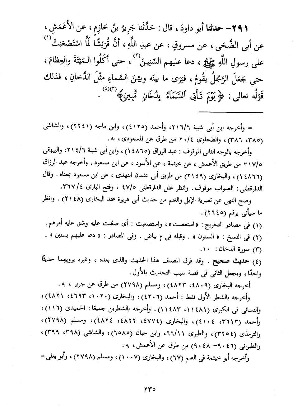 291 - حَدَّثَنَا أَبُو دَاوُدَ قَالَ: حَدَّثَنَا جَرِيرُ بْنُ حَازِمٍ، عَنِ الْأَعْمَشِ، عَنْ أَبِي الضُّحَى، عَنْ مَسْرُوقٍ، عَنْ عَبْدِ اللَّهِ، أَنَّ قُرَيْشًا لَمَّا اسْتَصْعَبَتْ عَلَى رَسُولِ اللَّهِ صَلَّى اللهُ عَلَيْهِ وَسَلَّمَ " §دَعَا عَلَيْهِمُ السِّنِينَ حَتَّى أَكَلُوا الْمَيْتَةَ وَالْعِظَامَ حَتَّى جَعَلَ الرَّجُلُ يَقُومُ فَيَرَى مَا بَيْنَهُ وَبَيْنَ السَّمَاءِ مِثْلَ الدُّخَانِ فَذَلِكَ قَوْلُهُ تَعَالَى {يَوْمَ تَأْتِي السَّمَاءُ بِدُخَانٍ مُبِينٍ} -[236]-[الدخان: 10] "