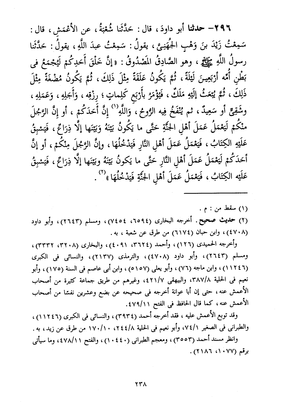 296 - حَدَّثَنَا أَبُو دَاوُدَ قَالَ: حَدَّثَنَا شُعْبَةُ، عَنِ الْأَعْمَشِ، قَالَ: سَمِعْتُ زَيْدَ بْنَ وَهْبٍ الْجُهَنِيَّ، يَقُولُ: سَمِعْتُ عَبْدَ اللَّهِ، يَقُولُ: حَدَّثَنَا رَسُولُ اللَّهِ صَلَّى اللهُ عَلَيْهِ وَسَلَّمَ وَهُوَ الصَّادِقُ الْمَصْدُوقُ: " إِنَّ §خَلْقَ أَحَدِكُمْ لَيُجْمَعُ فِي بَطْنِ أُمِّهِ أَرْبَعِينَ لَيْلَةً ثُمَّ يَكُونُ عَلَقَةً مِثْلَ ذَلِكَ ثُمَّ يَكُونُ مُضْغَةً مِثْلَ ذَلِكَ ثُمَّ يُبْعَثُ إِلَيْهِ مَلَكٌ فَيُؤْمَرُ بِأَرْبَعِ كَلِمَاتٍ: رِزْقِهِ وَأَجَلِهِ وَعَمَلِهِ وَشَقِيٌّ أَوْ سَعِيدٌ ثُمَّ يُنْفَخُ فِيهِ الرُّوحَ وَاللَّهِ إِنَّ أَحَدَكُمْ - أَوْ إِنَّ الرَّجُلَ مِنْكُمْ - لَيَعْمَلُ عَمَلَ أَهْلِ الْجَنَّةِ حَتَّى مَا يَكُونُ بَيْنَهُ وَبَيْنَهَا إِلَّا ذِرَاعٌ فَيَسْبِقُ عَلَيْهِ الْكِتَابُ فَيَعْمَلُ عَمَلَ أَهْلِ النَّارِ فَيَدْخُلُهَا، وَإِنَّ الرَّجُلَ مِنْكُمْ - أَوْ إِنَّ أَحَدَكُمْ - لَيَعْمَلُ عَمَلَ أَهْلِ النَّارِ حَتَّى مَا يَكُونُ بَيْنَهُ وَبَيْنَهَا إِلَّا ذِرَاعٌ فَيَسْبِقُ عَلَيْهِ الْكِتَابُ فَيَعْمَلُ عَمَلَ أَهْلِ الْجَنَّةِ فَيَدْخُلُهَا "