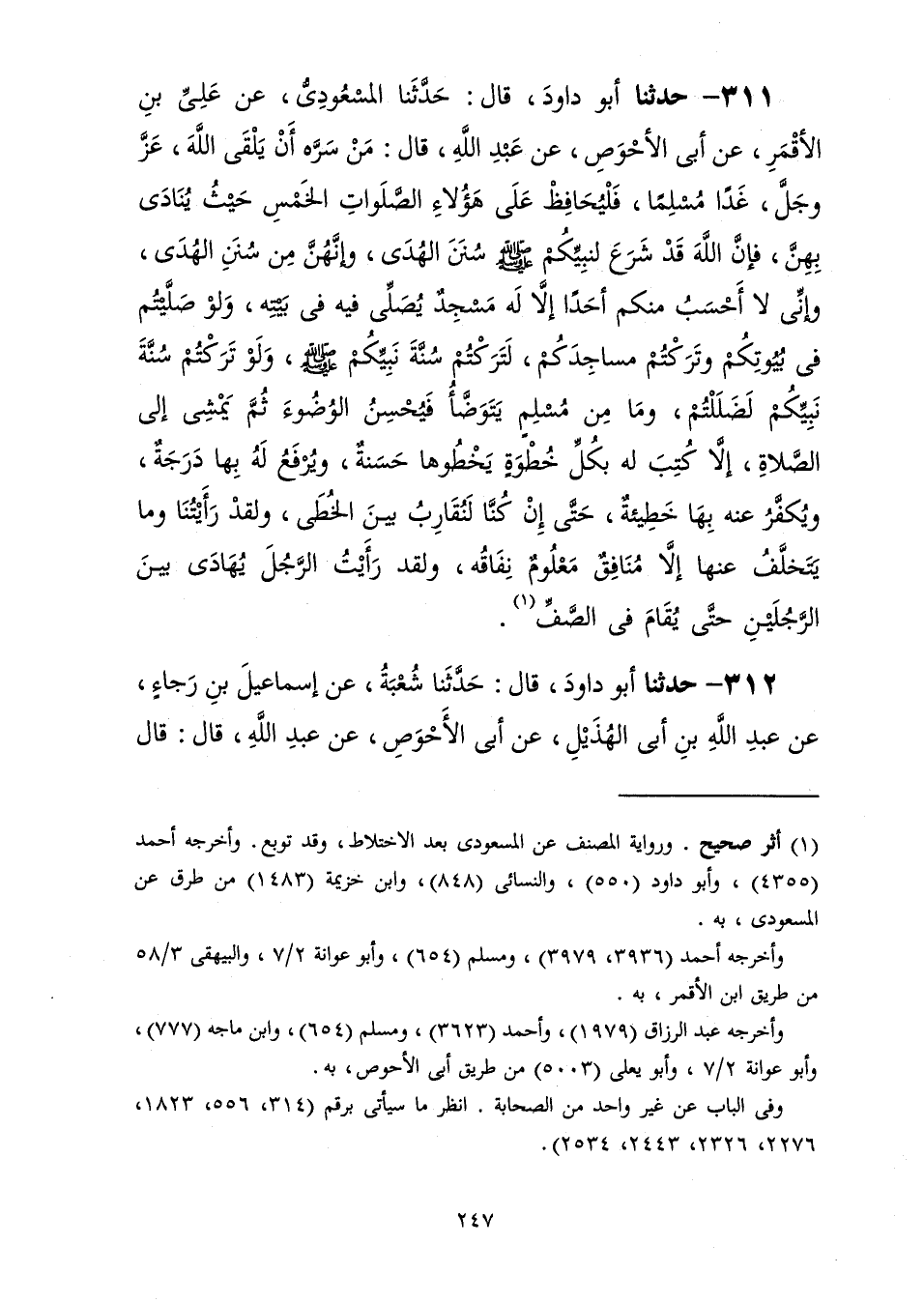 311 - حَدَّثَنَا أَبُو دَاوُدَ قَالَ: حَدَّثَنَا الْمَسْعُودِيُّ، عَنْ عَلِيِّ بْنِ الْأَقْمَرِ، عَنْ أَبِي الْأَحْوَصِ، عَنْ عَبْدِ اللَّهِ، قَالَ: «§مَنْ سَرَّهُ أَنْ يَلْقَى اللَّهَ عَزَّ وَجَلَّ غَدًا مُسْلِمًا فَلْيُحَافِظْ عَلَى هَؤُلَاءِ الصَّلَوَاتِ الْخَمْسِ حَيْثُ يُنَادَى بِهِنَّ فَإِنَّ اللَّهَ قَدْ شَرَعَ لِنَبِيِّكُمْ صَلَّى اللهُ عَلَيْهِ وَسَلَّمَ سُنَنَ الْهُدَى، وَإِنَّهُنَّ مِنْ سُنَنِ الْهُدَى، وَإِنِّي لَا أَحْسَبُ مِنْكُمْ أَحَدًا إِلَّا لَهُ مَسْجِدٌ يُصَلِّي فِيهِ فِي بَيْتِهِ، وَلَوْ صَلَّيْتُمْ فِي بُيُوتِكُمْ وَتَرَكْتُمْ مَسَاجِدَكُمْ لَتَرَكْتُمْ سُنَّةَ نَبِيِّكُمْ صَلَّى اللهُ عَلَيْهِ وَسَلَّمَ، وَلَوْ تَرَكْتُمْ سُنَّةَ نَبِيِّكُمْ لَضَلَلْتُمْ، وَمَا مِنْ مُسْلِمٍ يَتَوَضَّأُ فَيُحْسِنُ الْوُضُوءَ ثُمَّ يَمْشِي إِلَى الصَّلَاةِ إِلَّا كُتِبَ لَهُ بِكُلِّ خُطْوَةٍ يَخْطُوهَا حَسَنَةٌ وَيُرْفَعُ لَهُ بِهَا دَرَجَةٌ وَيُكَفَّرُ عَنْهُ بِهَا خَطِيئَةٌ حَتَّى إِنْ كُنَّا لَنُقَارِبُ بَيْنَ الْخُطَى وَلَقَدْ رَأَيْتُنَا وَمَا يَتَخَلَّفُ عَنْهَا إِلَّا مُنَافِقٌ مَعْلُومٌ نِفَاقُهُ وَلَقَدْ رَأَيْتُ الرَّجُلَ يُهَادَى بَيْنَ الرَّجُلَيْنِ حَتَّى يُقَامَ فِي الصَّفِّ»