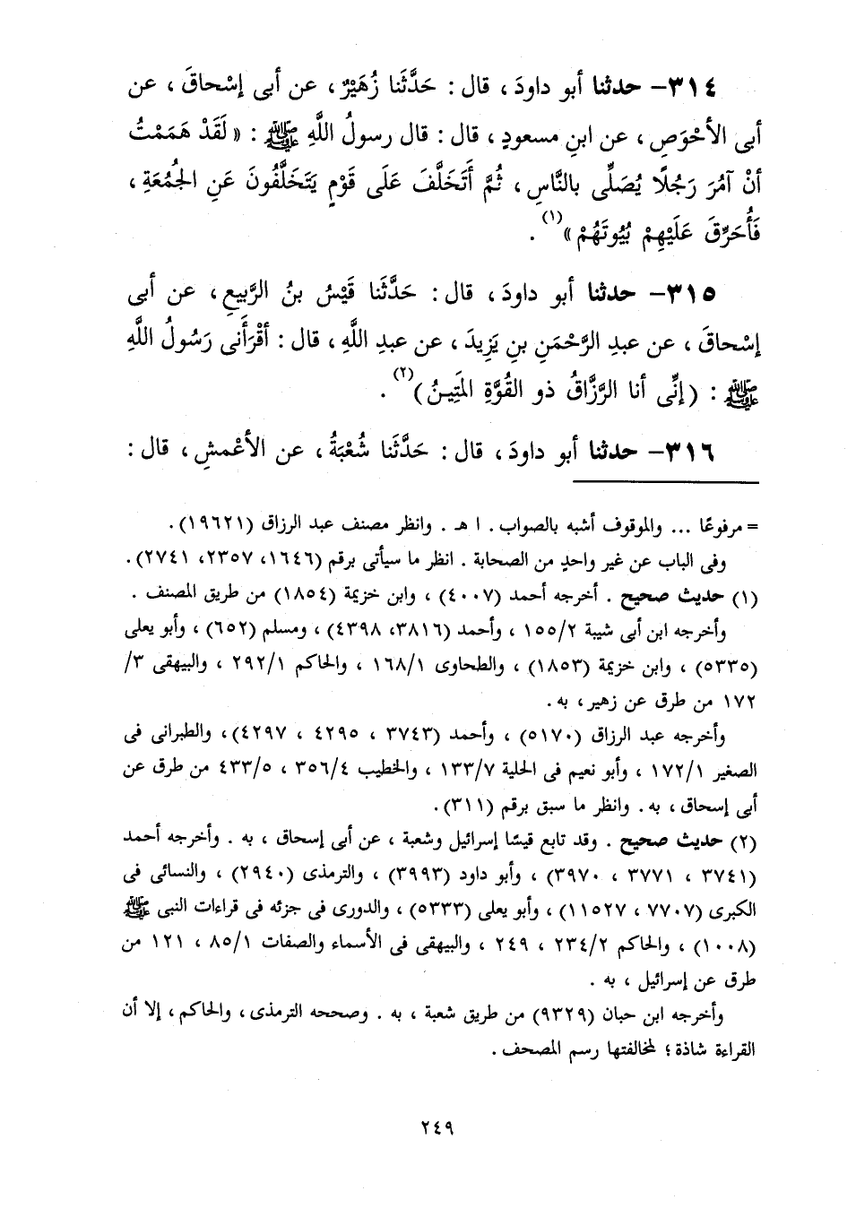 314 - حَدَّثَنَا أَبُو دَاوُدَ قَالَ: حَدَّثَنَا زُهَيْرٌ، عَنْ أَبِي إِسْحَاقَ، عَنْ أَبِي الْأَحْوَصِ، عَنِ ابْنِ مَسْعُودٍ، قَالَ: قَالَ رَسُولُ اللَّهِ صَلَّى اللهُ عَلَيْهِ وَسَلَّمَ: «لَقَدْ §هَمَمْتُ أَنْ آمُرَ رَجُلًا يُصَلِّي بِالنَّاسِ ثُمَّ أَتَخَلَّفَ عَلَى قَوْمٍ يَتَخَلَّفُونَ عَنِ الْجُمُعَةِ فَأُحَرِّقَ عَلَيْهِمْ بُيُوتَهُمْ»
