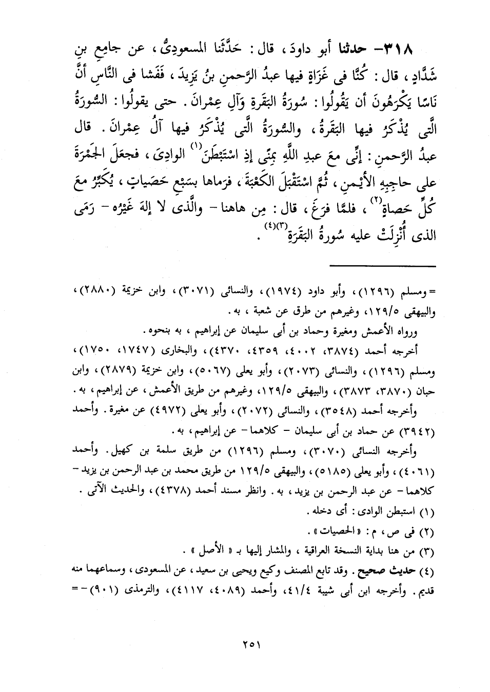 318 - حَدَّثَنَا أَبُو دَاوُدَ قَالَ: حَدَّثَنَا الْمَسْعُودِيُّ، عَنْ جَامِعِ بْنِ شَدَّادٍ، قَالَ: كُنَّا فِي غَزَاةٍ فِيهَا عَبْدُ الرَّحْمَنِ بْنُ يَزِيدَ، فَفَشَا فِي النَّاسِ أَنَّ نَاسًا يَكْرَهُونَ أَنْ يَقُولُوا: سُورَةُ الْبَقَرَةِ، وَآلِ عِمْرَانَ حَتَّى يَقُولُوا: السُّورَةُ الَّتِي يُذْكَرُ فِيهَا الْبَقَرَةُ وَالسُّورَةُ الَّتِي يُذْكَرُ فِيهَا آلُ عِمْرَانَ، قَالَ عَبْدُ الرَّحْمَنِ: إِنِّي مَعَ عَبْدِ اللَّهِ بِمِنًى إِذِ اسْتَبْطَنَ الْوَادِيَ، فَجَعَلَ الْجَمْرَةَ عَلَى حَاجِبِهِ الْأَيْمَنِ، ثُمَّ اسْتَقْبَلَ الْكَعْبَةَ فَرَمَاهَا بِسَبْعِ حَصَيَاتٍ، يُكَبِّرُ مَعَ كُلِّ حَصَاةٍ، فَلَمَّا فَرَغَ قَالَ: «مِنْ هَا هُنَا وَالَّذِي لَا إِلَهَ غَيْرُهُ §رَمَى الَّذِي أُنْزِلَتْ عَلَيْهِ سُورَةُ الْبَقَرَةِ»