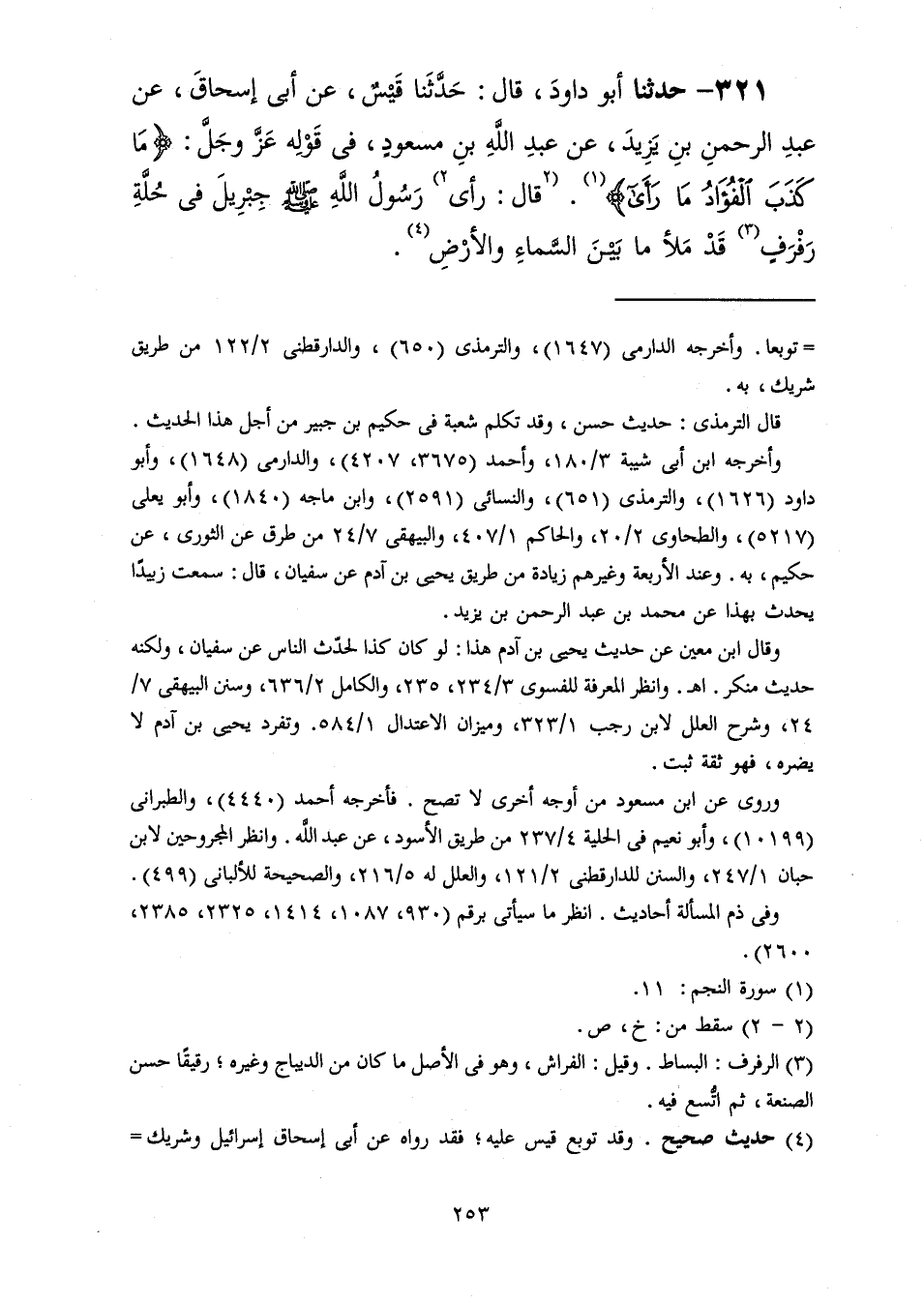 321 - حَدَّثَنَا أَبُو دَاوُدَ قَالَ: حَدَّثَنَا قَيْسٌ، عَنْ أَبِي إِسْحَاقَ، عَنْ عَبْدِ الرَّحْمَنِ بْنِ يَزِيدَ، عَنْ عَبْدِ اللَّهِ بْنِ مَسْعُودٍ، فِي قَوْلِهِ عَزَّ وَجَلَّ {مَا كَذَبَ الْفُؤَادُ مَا رَأَى} [النجم: 11] قَالَ: «§رَأَى رَسُولُ اللَّهِ صَلَّى اللهُ عَلَيْهِ وَسَلَّمَ جِبْرِيلَ فِي حُلَّةِ رَفْرَفٍ قَدْ مَلَأَ مَا بَيْنَ السَّمَاءِ وَالْأَرْضِ»