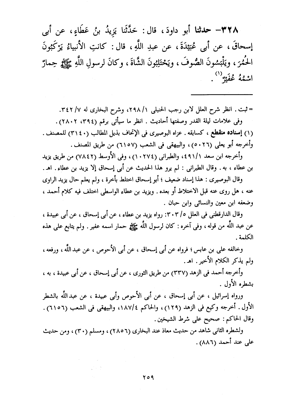 328 - حَدَّثَنَا أَبُو دَاوُدَ قَالَ: حَدَّثَنَا يَزِيدُ بْنُ عَطَاءٍ، عَنْ أَبِي إِسْحَاقَ، عَنْ أَبِي عُبَيْدَةَ، عَنْ عَبْدِ اللَّهِ، قَالَ: «كَانَتِ §الْأَنْبِيَاءُ يَرْكَبُونَ الْحُمُرَ وَيُلْبَسُونَ الصُّوفَ وَيَحْتَلِبُونَ الشَّاةَ وَكَانَ لِرَسُولِ اللَّهِ صَلَّى اللهُ عَلَيْهِ وَسَلَّمَ حِمَارٌ اسْمُهُ عُفَيْرٌ»