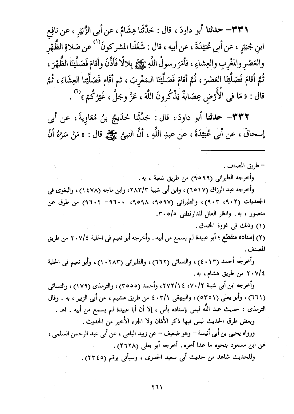 331 - حَدَّثَنَا أَبُو دَاوُدَ قَالَ: حَدَّثَنَا هِشَامٌ، عَنْ أَبِي الزُّبَيْرِ، عَنْ نَافِعِ بْنِ جُبَيْرٍ، عَنْ أَبِي عُبَيْدَةَ، عَنْ أَبِيهِ، قَالَ: شَغَلَنَا الْمُشْرِكُونَ عَنْ صَلَاةِ الظُّهْرِ، وَالْعَصْرِ وَالْمَغْرِبِ وَالْعِشَاءِ، فَأَمَرَ رَسُولُ اللَّهِ صَلَّى اللهُ عَلَيْهِ وَسَلَّمَ بِلَالًا فَأَذَّنَ وَأَقَامَ فَصَلَّيْنَا الظُّهْرَ ثُمَّ أَقَامَ فَصَلَّيْنَا الْعَصْرَ ثُمَّ أَقَامَ فَصَلَّيْنَا الْمَغْرِبَ ثُمَّ أَقَامَ فَصَلَّيْنَا الْعِشَاءَ ثُمَّ قَالَ: «§مَا فِي الْأَرْضِ عِصَابَةٌ يَذْكُرُونَ اللَّهَ عَزَّ وَجَلَّ غَيْرُكُمْ»