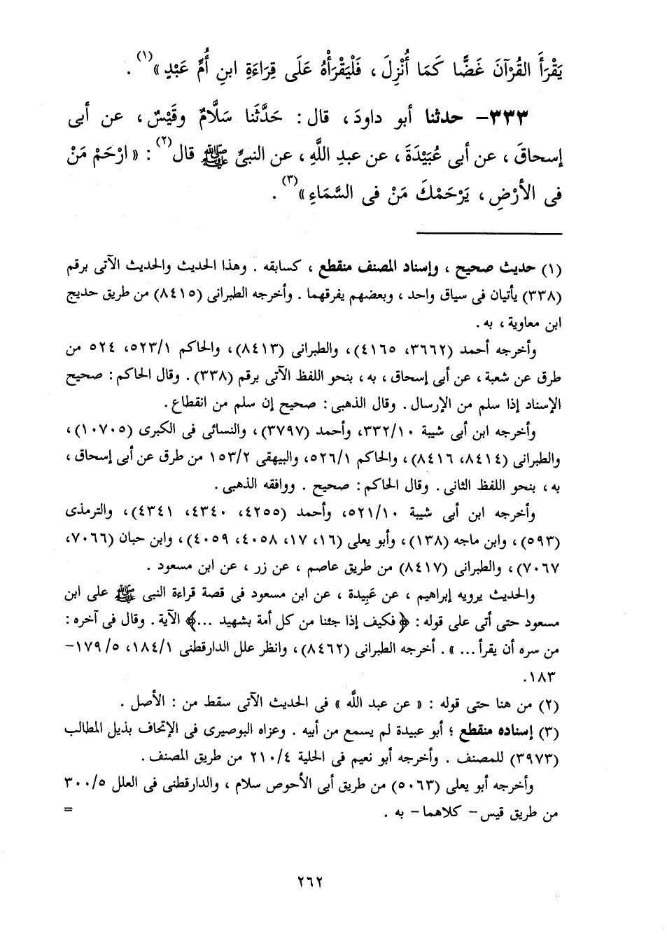 333 - حَدَّثَنَا أَبُو دَاوُدَ قَالَ: حَدَّثَنَا سَلَّامٌ، وَقَيْسٌ، عَنْ أَبِي إِسْحَاقَ، عَنْ أَبِي عُبَيْدَةَ، عَنْ عَبْدِ اللَّهِ، عَنِ النَّبِيِّ صَلَّى اللهُ عَلَيْهِ وَسَلَّمَ قَالَ: «§ارْحَمْ مَنْ فِي الْأَرْضِ يَرْحَمْكَ مَنْ فِي السَّمَاءِ»