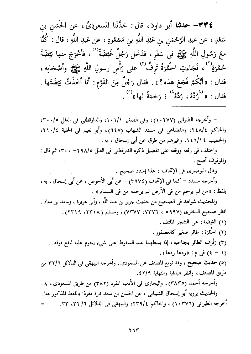 334 - حَدَّثَنَا أَبُو دَاوُدَ قَالَ: حَدَّثَنَا الْمَسْعُودِيُّ، عَنِ الْحَسَنِ بْنِ سَعْدٍ، عَنْ عَبْدِ الرَّحْمَنِ بْنِ عَبْدِ اللَّهِ بْنِ مَسْعُودٍ، عَنْ عَبْدِ اللَّهِ، قَالَ: كُنَّا مَعَ رَسُولِ اللَّهِ صَلَّى اللهُ عَلَيْهِ وَسَلَّمَ فِي سَفَرٍ فَدَخَلَ رَجُلٌ غَيْضَةً فَأَخْرَجَ مِنْهَا بَيْضَةَ حُمَّرَةٍ فَجَاءَتِ الْحُمَّرَةُ تَرِفُّ عَلَى رَأْسِ رَسُولِ اللَّهِ صَلَّى اللهُ عَلَيْهِ وَسَلَّمَ وَأَصْحَابِهِ فَقَالَ: «§أَيُّكُمْ فَجَعَ هَذِهِ؟» فَقَالَ رَجُلٌ مِنَ الْقَوْمِ: أَنَا أَخَذْتُ بَيْضَتَهَا فَقَالَ: «رُدَّهُ رُدَّهُ رَحْمَةً لَهَا»