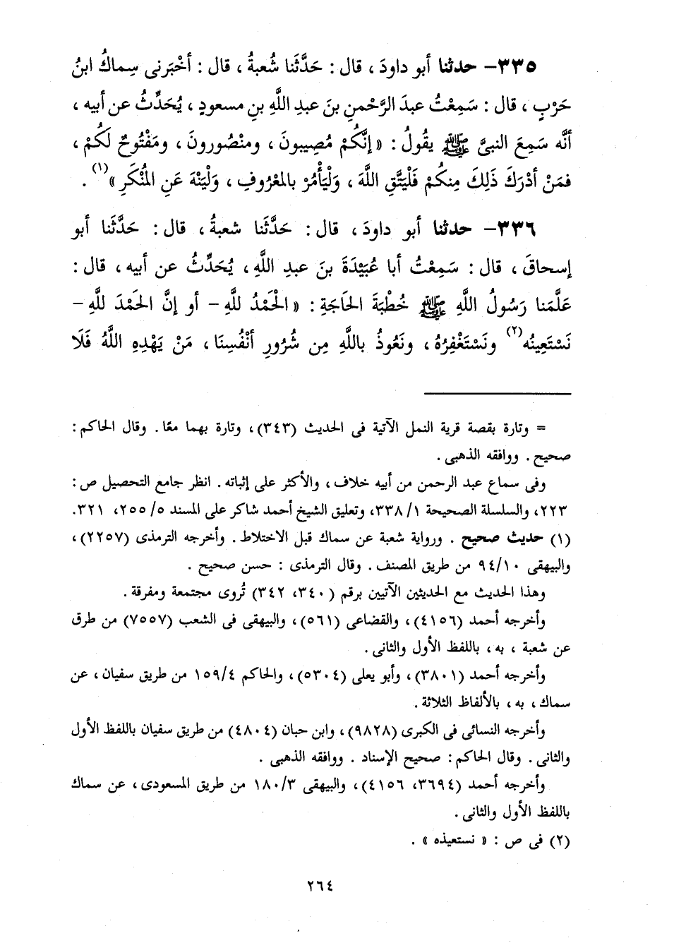 336 - حَدَّثَنَا أَبُو دَاوُدَ قَالَ: حَدَّثَنَا شُعْبَةُ، قَالَ: حَدَّثَنَا أَبُو إِسْحَاقَ، قَالَ: سَمِعْتُ أَبَا عُبَيْدَةَ بْنَ عَبْدِ اللَّهِ، يُحَدِّثُ عَنْ أَبِيهِ، قَالَ: §عَلَّمَنَا رَسُولُ اللَّهِ صَلَّى اللهُ عَلَيْهِ وَسَلَّمَ خُطْبَةَ الْحَاجَةِ: " الْحَمْدُ لِلَّهِ أَوْ إِنَّ الْحَمْدَ لِلَّهِ نَسْتَعِينُهُ وَنَسْتَغْفِرُهُ وَنَعُوذُ بِاللَّهِ مِنْ شُرُورِ أَنْفُسِنَا مَنْ يَهْدِهِ اللَّهُ فَلَا -[265]- مُضِلَّ لَهُ وَمَنْ يُضْلِلْ فَلَا هَادِيَ لَهُ وَأَشْهَدُ أَنْ لَا إِلَهَ إِلَّا اللَّهُ وَأَشْهَدُ أَنَّ مُحَمَّدًا عَبْدُهُ وَرَسُولُهُ ثُمَّ يَقْرَأُ الثَّلَاثَ الْآيَاتِ {يَا أَيُّهَا الَّذِينَ آمَنُوا اتَّقُوا اللَّهَ حَقَّ تُقَاتِهِ} [آل عمران: 102] إِلَى آخِرِ الْآيَةِ وَيَقْرَأُ {يَا أَيُّهَا النَّاسُ اتَّقُوا رَبَّكُمُ الَّذِي خَلَقَكُمْ مِنْ نَفْسٍ وَاحِدَةٍ} [النساء: 1] الْآيَةَ ثُمَّ يَقْرَأُ {يَا أَيُّهَا الَّذِينَ آمَنُوا اتَّقُوا اللَّهَ وَقُولُوا قَوْلًا سَدِيدًا يُصْلِحْ لَكُمْ أَعْمَالَكُمْ} [الأحزاب: 71] إِلَى آخِرِ الْآيَةِ " ثُمَّ تَتَكَلَّمُ بِحَاجَتِكَ، قَالَ شُعْبَةُ: قُلْتُ لِأَبِي إِسْحَاقَ هَذِهِ فِي خُطْبَةِ النِّكَاحِ أَوْ فِي غَيْرِهَا؟ قَالَ: فِي كُلِّ حَاجَةٍ