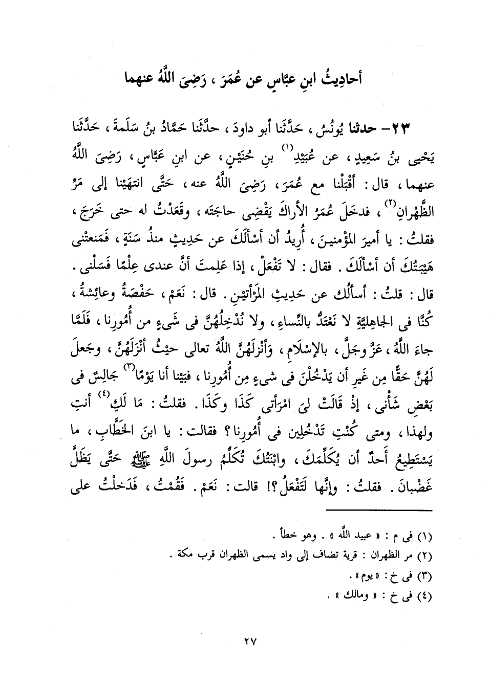 23 - حَدَّثَنَا يُونُسُ، حَدَّثَنَا أَبُو دَاوُدَ، حَدَّثَنَا حَمَّادُ بْنُ سَلَمَةَ، حَدَّثَنَا يَحْيَى بْنُ سَعِيدٍ، عَنْ عُبَيْدُ بْنُ حُنَيْنٍ، عَنِ ابْنِ عَبَّاسٍ رَضِيَ اللَّهُ عَنْهُمَا، قَالَ: أَقْبَلْنَا مَعَ عُمَرَ رَضِيَ اللَّهُ عَنْهُ حَتَّى انْتَهَيْنَا إِلَى مَرِّ الظَّهْرَانِ فَدَخَلَ عُمَرُ الْأَرَاكَ يَقْضِي حَاجَتَهُ وَقَعَدْتُ لَهُ حَتَّى خَرَجَ فَقُلْتُ: يَا أَمِيرَ الْمُؤْمِنِينَ أُرِيدُ أَنْ أَسْأَلَكَ عَنْ حَدِيثٍ مُنْذُ سَنَةٍ فَمَنَعَتْنِي هَيْبَتُكَ أَنْ أَسْأَلَكَ فَقَالَ: لَا تَفْعَلْ إِذَا عَلِمْتَ أَنَّ عِنْدِي عِلْمًا فَسَلْنِي قَالَ: قُلْتُ أَسْأَلُكَ عَنْ حَدِيثِ الْمَرْأَتَيْنِ؟ قَالَ: نَعَمْ حَفْصَةُ وَعَائِشَةُ كُنَّا فِي الْجَاهِلِيَّةِ لَا نَعْتَدُّ بِالنِّسَاءِ وَلَا نُدْخِلُهُنَّ فِي شَيْءٍ مِنْ أُمُورِنَا فَلَمَّا جَاءَ اللَّهُ عَزَّ وَجَلَّ بِالْإِسْلَامِ وَأَنْزَلَهُنَّ اللَّهُ تَعَالَى حَيْثُ أَنْزَلَهُنَّ وَجَعَلَ لَهُنَّ حَقًّا مِنْ غَيْرِ أَنْ يَدْخُلْنَ فِي شَيْءٍ مِنْ أُمُورِنَا فَبَيْنَا أَنَا يَوْمًا جَالِسٌ فِي بَعْضِ شَأْنِي إِذْ قَالَتْ لِيَ امْرَأَتِي كَذَا وَكَذَا فَقُلْتُ: مَا لَكِ أَنْتِ وَلِهَذَا؟ وَمَتَى كُنْتِ تَدْخُلِينَ فِي أُمُورِنَا؟ فَقَالَتْ: يَا ابْنَ الْخَطَّابِ مَا يَسْتَطِيعُ أَحَدٌ أَنْ يُكَلِّمَكَ وَابْنَتُكَ تُكَلِّمُ رَسُولَ اللَّهِ صَلَّى اللهُ عَلَيْهِ وَسَلَّمَ حَتَّى يَظَلَّ غَضْبَانَ فَقُلْتُ: وَإِنَّهَا لَتَفْعَلُ؟ قَالَتْ: نَعَمْ فَقُمْتُ فَدَخَلْتُ عَلَى -[28]- حَفْصَةَ فَقُلْتُ: يَا حَفْصَةُ أَلَا تَتَّقِينَ اللَّهَ §تُكَلِّمِينَ رَسُولَ اللَّهِ صَلَّى اللهُ عَلَيْهِ وَسَلَّمَ حَتَّى يَظَلَّ غَضْبَانَ وَيْحَكِ لَا تَغْتَرِّينَ بِحُسْنِ عَائِشَةَ وَحُبِّ رَسُولِ اللَّهِ صَلَّى اللهُ عَلَيْهِ وَسَلَّمَ إِيَّاهَا ثُمَّ أَتَيْتُ أُمَّ سَلَمَةَ أَيْضًا فَقُلْتُ لَهَا مِثْلَ ذَلِكَ فَقَالَتْ: لَقَدْ دَخَلْتَ يَا ابْنَ الْخَطَّابِ فِي كُلِّ شَيْءٍ حَتَّى بَيْنَ رَسُولِ اللَّهِ صَلَّى اللهُ عَلَيْهِ وَسَلَّمَ وَبَيْنَ نِسَائِهِ، وَكَانَ لِي صَاحِبٌ مِنَ الْأَنْصَارِ يَحْضُرُ رَسُولَ اللَّهِ صَلَّى اللهُ عَلَيْهِ وَسَلَّمَ إِذَا غِبْتُ وَأَحْضُرُهُ إِذَا غَابَ وَيُخْبِرُنِي وَأُخْبِرُهُ وَلَمْ يَكُنْ أَحَدٌ أَخْوَفَ عِنْدَنَا أَنْ يَغْزُوَنَا مِنْ مَلِكٍ مِنْ مُلُوكِ غَسَّانَ فَلَمَّا هَدَّأَ اللَّهُ الْأَمْرَ عَنَّا فَبَيْنَا أَنَا ذَاتَ يَوْمٍ جَالِسٌ فِي بَعْضِ أَمْرِي إِذْ جَاءَ صَاحِبِي فَقَالَ: أَبَا حَفْصٍ أَبَا حَفْصٍ مَرَّتَيْنِ فَقُلْتُ: وَيْلَكَ مَا لَكَ أَجَاءَ الْغَسَّانِيُّ أَجَاءَ الْغَسَّانِيُّ؟ قَالَ: لَا وَلَكِنْ طَلَّقَ رَسُولُ اللَّهِ صَلَّى اللهُ عَلَيْهِ وَسَلَّمَ نِسَاءَهُ فَقُلْتُ: رَغِمَ أَنْفُ حَفْصَةَ رَغِمَ أَنْفُ حَفْصَةَ وَانْتَعَلْتُ وَأَتَيْتُ النَّبِيَّ صَلَّى اللهُ عَلَيْهِ وَسَلَّمَ فَإِذَا فِي كُلِّ بَيْتٍ بُكَاءٌ وَإِذَا رَسُولُ اللَّهِ صَلَّى اللهُ عَلَيْهِ وَسَلَّمَ فِي مَشْرُبَةٍ وَإِذَا عَلَى الْبَابِ غُلَامٌ أَسْوَدُ فَقُلْتُ: اسْتَأْذَنْ لِي عَلَى رَسُولِ اللَّهِ صَلَّى اللهُ عَلَيْهِ وَسَلَّمَ فَاسْتَأْذَنَ فَأَذِنَ لِي فَإِذَا هُوَ نَائِمٌ عَلَى حَصِيرٍ تَحْتَ رَأْسِهِ وِسَادَةٌ مِنْ أُُدُمٍ حَشْوُهَا لِيفٌ وَإِذَا قَرَظٌ وَأُهُبٌ مُعَلَّقَةٌ فَأَنْشَأْتُ أُخْبِرُهُ بِمَا قُلْتُ لِحَفْصَةَ، وَأُمِّ سَلَمَةَ «وَكَانَ آلَى مِنْ نِسَائِهِ -[29]- شَهْرًا فَلَمَّا كَانَ لَيْلَةُ تِسْعٍ وَعِشْرِينَ نَزَلَ إِلَيْهِنَّ»