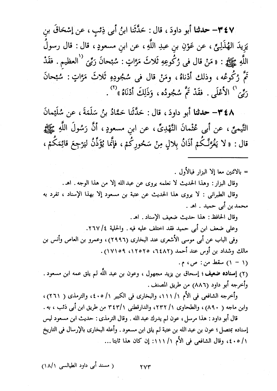 348 - حَدَّثَنَا أَبُو دَاوُدَ قَالَ: حَدَّثَنَا حَمَّادُ بْنُ سَلَمَةَ، عَنْ سُلَيْمَانَ التَّيْمِيِّ، عَنْ أَبِي عُثْمَانَ النَّهْدِيِّ، عَنِ ابْنِ مَسْعُودٍ، أَنَّ رَسُولَ اللَّهِ صَلَّى اللهُ عَلَيْهِ وَسَلَّمَ قَالَ: «§لَا يَغُرَّنَّكُمْ أَذَانُ بِلَالٍ مِنْ سُحُورِكُمْ فَإِنَّمَا يُؤَذِّنُ لِيَرْجِعَ قَائِمُكُمْ -[274]- وَلِيَسْتَيْقِظَ نَائِمُكُمْ وَلَا هَذَا الْفَجْرُ الَّذِي هُوَ هَكَذَا يَعْنِي السَّاطِعَ، وَلَكِنِ الْفَجْرِ الَّذِي هُوَ هَكَذَا يَعْنِي الْمُسْتَطِيلَ»