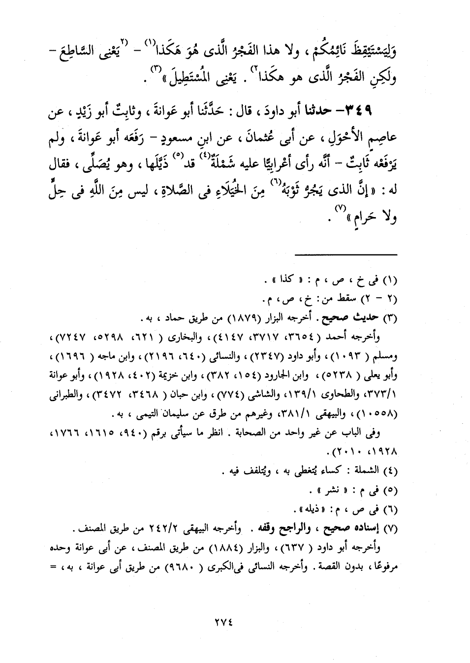 349 - حَدَّثَنَا أَبُو دَاوُدَ قَالَ: حَدَّثَنَا أَبُو عَوَانَةَ، وَثَابِتٌ أَبُو زَيْدٍ، عَنْ عَاصِمٍ الْأَحْوَلِ، عَنْ أَبِي عُثْمَانَ، عَنِ ابْنِ مَسْعُودٍ، رَفَعَهُ أَبُو عَوَانَةَ وَلَمْ يَرْفَعْهُ ثَابِتٌ أَنَّهُ رَأَى أَعْرَابِيًّا عَلَيْهِ شَمْلَةٌ قَدْ ذَيَّلَهَا وَهُوَ يُصَلِّي فَقَالَ لَهُ: «إِنَّ §الَّذِي يَجُرُّ ثَوْبَهُ مِنَ الْخُيَلَاءِ فِي الصَّلَاةِ لَيْسَ مِنَ اللَّهِ فِي حِلٍّ وَلَا حَرَامٍ»