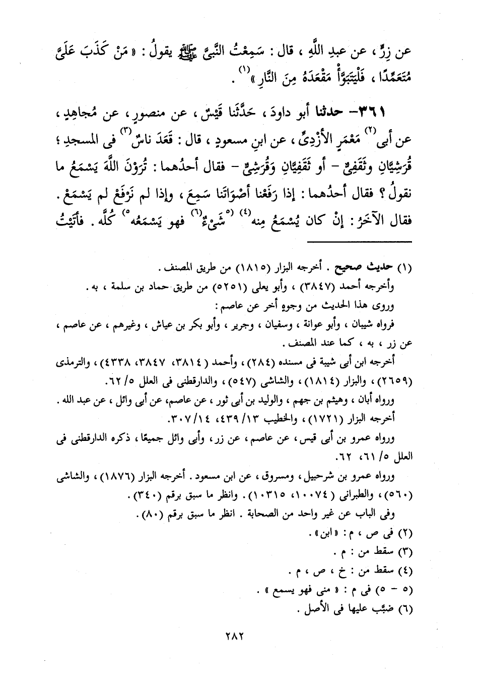 361 - حَدَّثَنَا أَبُو دَاوُدَ قَالَ: حَدَّثَنَا قَيْسٌ، عَنْ مَنْصُورٍ، عَنْ مُجَاهِدٍ، عَنِ أَبِي مَعْمَرٍ الْأَزْدِيِّ، عَنِ ابْنِ مَسْعُودٍ، قَالَ: " قَعَدَ نَاسٌ فِي الْمَسْجِدِ قُرَشِيَّانِ وَثَقَفِيٌّ أَوْ ثَقَفِيَّانِ وَقُرَشِيٌّ فَقَالَ أَحَدُهُمَا: تُرَوْنَ اللَّهَ يَسْمَعُ مَا نَقُولُ؟ فَقَالَ أَحَدُهُمَا: إِذَا رَفَعْنَا أَصْوَاتَنَا سَمِعَ وَإِذَا لَمْ نَرْفَعْ لَمْ يَسْمَعْ، فَقَالَ الْآخَرُ: §إِنْ كَانَ يُسْمَعُ مِنْهُ شَيْءٌ فَهُوَ يَسْمَعُهُ كُلَّهُ، فَأَتَيْتُ -[283]- رَسُولَ اللَّهِ صَلَّى اللهُ عَلَيْهِ وَسَلَّمَ فَذَكَرْتُ ذَلِكَ لَهُ فَأَنْزَلَ اللَّهُ عَزَّ وَجَلَّ {وَمَا كُنْتُمْ تَسْتَتِرُونَ أَنْ يَشْهَدَ عَلَيْكُمْ سَمْعُكُمْ} [فصلت: 22] الْآيَةَ "