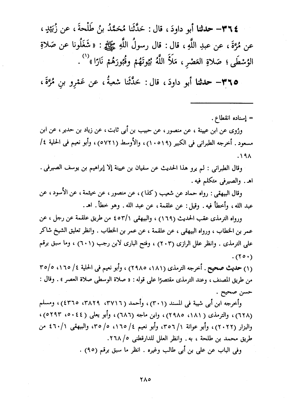 364 - حَدَّثَنَا أَبُو دَاوُدَ قَالَ: حَدَّثَنَا مُحَمَّدُ بْنُ طَلْحَةَ، عَنْ زُبَيْدٍ، عَنْ مُرَّةَ، عَنْ عَبْدِ اللَّهِ، قَالَ: قَالَ رَسُولُ اللَّهِ صَلَّى اللهُ عَلَيْهِ وَسَلَّمَ: «§شَغَلُونَا عَنِ الصَّلَاةِ الْوسْطَى صَلَاةِ الْعَصْرِ مَلَأَ اللَّهُ بُيُوتَهُمْ وَقُبُورَهُمْ نَارًا»