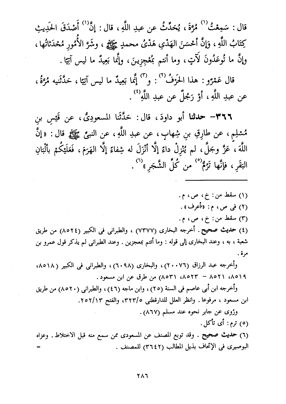 366 - حَدَّثَنَا أَبُو دَاوُدَ قَالَ: حَدَّثَنَا الْمَسْعُودِيُّ، عَنْ قَيْسِ بْنِ مُسْلِمٍ، عَنْ طَارِقِ بْنِ شِهَابٍ، عَنْ عَبْدِ اللَّهِ، عَنِ النَّبِيِّ صَلَّى اللهُ عَلَيْهِ وَسَلَّمَ قَالَ: «إِنَّ §اللَّهَ عَزَّ وَجَلَّ لَمْ يُنْزِلْ دَاءً إِلَّا أَنْزَلَ لَهُ شِفَاءً إِلَّا الْهَرَمَ فَعَلَيْكُمْ بِأَلْبَانِ الْبَقَرِ فَإِنَّهَا تَرُمُّ مِنْ كُلِّ الشَّجَرِ»