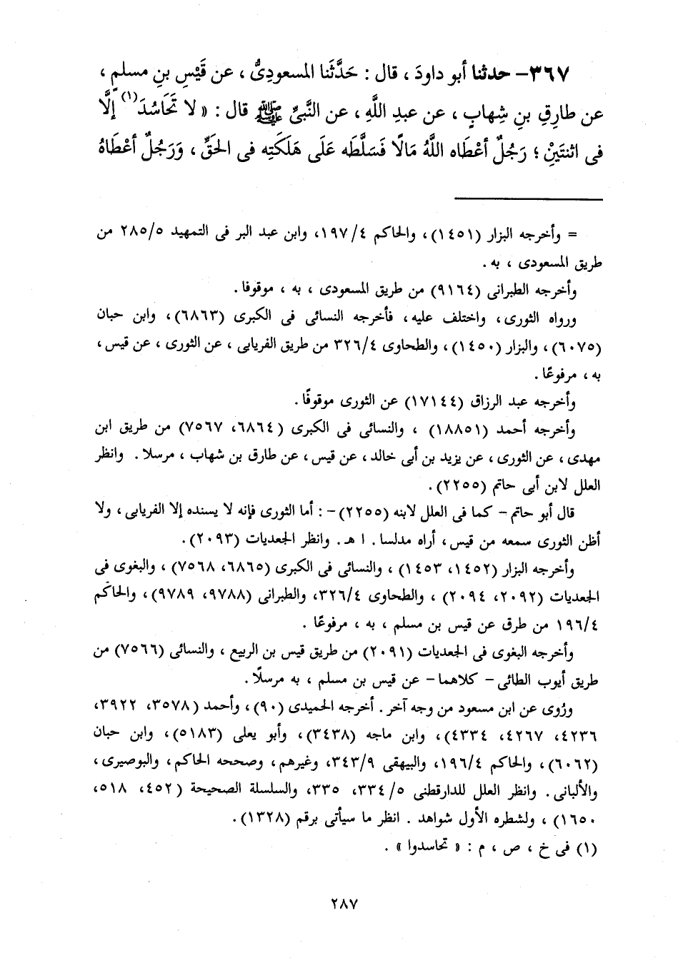 367 - حَدَّثَنَا أَبُو دَاوُدَ قَالَ: حَدَّثَنَا الْمَسْعُودِيُّ، عَنْ قَيْسِ بْنِ مُسْلِمٍ، عَنْ طَارِقِ بْنِ شِهَابٍ، عَنْ عَبْدِ اللَّهِ، عَنِ النَّبِيِّ صَلَّى اللهُ عَلَيْهِ وَسَلَّمَ قَالَ: " §لَا تَحَاسُدَ إِلَّا فِي اثْنَتَيْنِ: رَجُلٌ أَعْطَاهُ اللَّهُ مَالًا فَسَلَّطَهُ عَلَى هَلَكَتِهِ فِي الْحَقِّ، وَرَجُلٌ أَعْطَاهُ -[288]- اللَّهُ عَزَّ وَجَلَّ حِكْمَةً وَعِلْمًا، فَهُوَ يُقْضَى بِهَا وَيُعَلِّمُهَا النَّاسَ "
