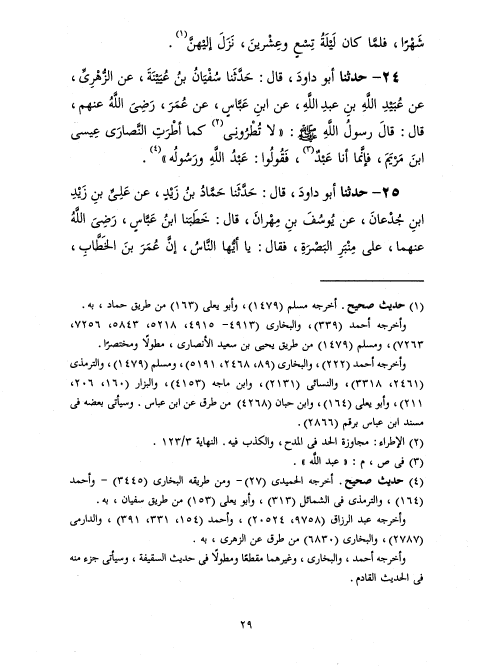 24 - حَدَّثَنَا أَبُو دَاوُدَ قَالَ: حَدَّثَنَا سُفْيَانُ بْنُ عُيَيْنَةَ، عَنِ الزُّهْرِيِّ، عَنْ عُبَيْدِ اللَّهِ بْنِ عَبْدِ اللَّهِ، عَنِ ابْنِ عَبَّاسٍ، عَنْ عُمَرَ رَضِيَ اللَّهُ عَنْهُمْ، قَالَ: قَالَ رَسُولُ اللَّهِ صَلَّى اللهُ عَلَيْهِ وَسَلَّمَ: " §لَا تُطْرُونِي كَمَا أَطْرَتِ النَّصَارَى عِيسَى ابْنَ مَرْيَمَ فَإِنَّمَا أَنَا عَبْدٌ فَقُولُوا: عَبْدُ اللَّهِ وَرَسُولُهُ "