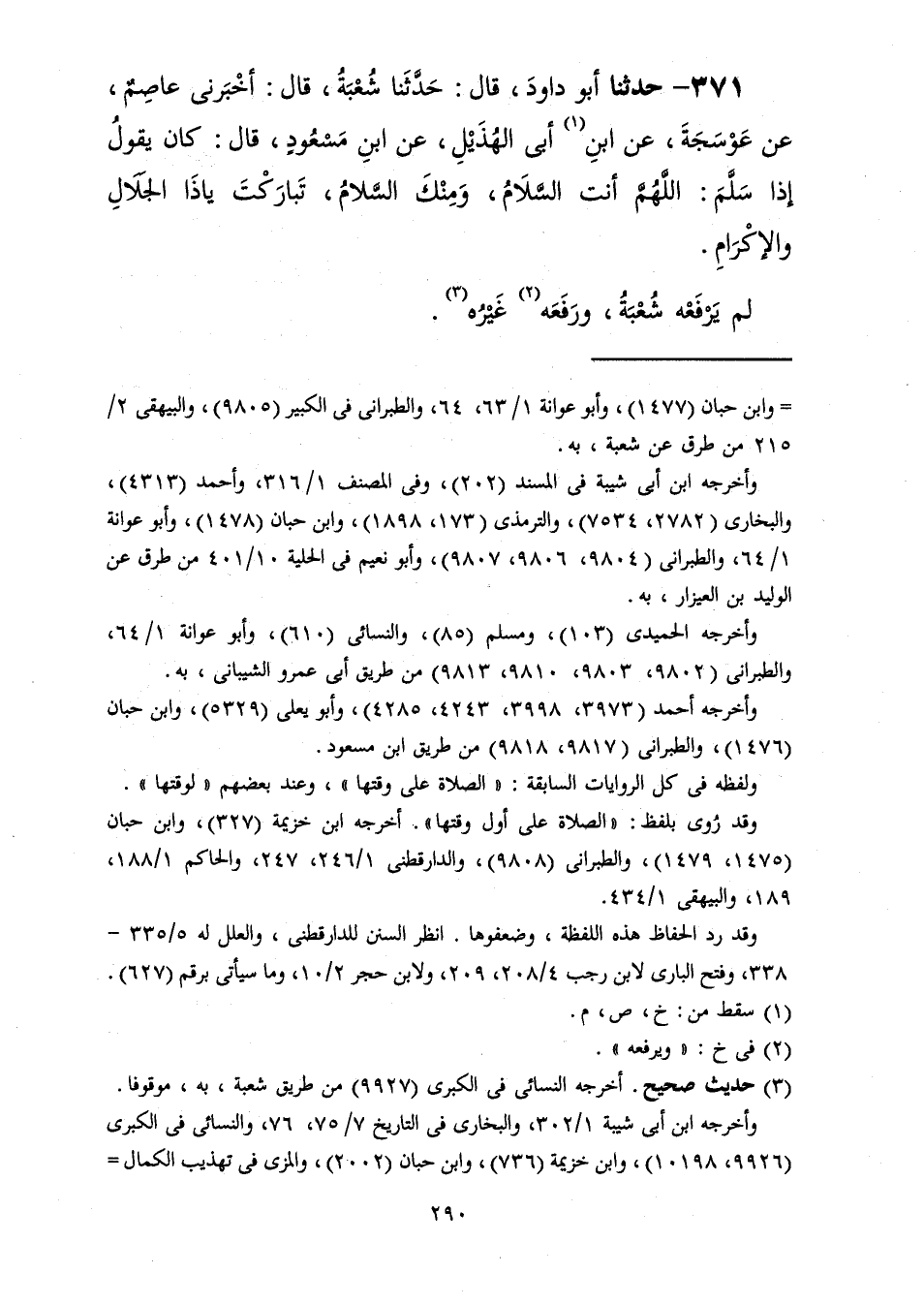 371 - حَدَّثَنَا أَبُو دَاوُدَ قَالَ: حَدَّثَنَا شُعْبَةُ، قَالَ: أَخْبَرَنِي عَاصِمٌ، عَنْ عَوْسَجَةَ، عَنْ ابْنِ أَبِي الْهُذَيْلِ، عَنِ ابْنِ مَسْعُودٍ، قَالَ: كَانَ §يَقُولُ إِذَا سَلَّمَ: «اللَّهُمَّ أَنْتَ السَّلَامُ وَمِنْكَ السَّلَامُ تَبَارَكْتَ يَا ذَا الْجَلَالِ وَالْإِكْرَامِ» لَمْ يَرْفَعْهُ شُعْبَةُ وَرَفَعَهُ غَيْرُهُ