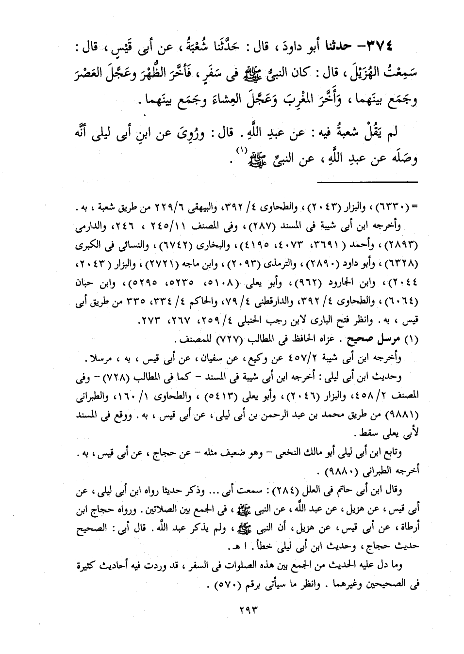 374 - حَدَّثَنَا أَبُو دَاوُدَ قَالَ: حَدَّثَنَا شُعْبَةُ، عَنْ أَبِي قَيْسٍ، قَالَ: سَمِعْتُ الْهُزَيْلِ، قَالَ: «§كَانَ النَّبِيُّ صَلَّى اللهُ عَلَيْهِ وَسَلَّمَ فِي سَفَرٍ فَأَخَّرَ الظُّهْرَ وَعَجَّلَ الْعَصْرَ وَجَمَعَ بَيْنَهُمَا وَأَخَّرَ الْمَغْرِبَ وَعَجَّلَ الْعِشَاءَ وَجَمَعَ بَيْنَهُمَا» لَمْ يَقُلْ شُعْبَةُ فِيهِ: عَنْ عَبْدِ اللَّهِ قَالَ: وَرُوِيَ عَنِ ابْنِ أَبِي لَيْلَى أَنَّهُ وَصَلَهُ عَنْ عَبْدِ اللَّهِ عَنِ النَّبِيِّ صَلَّى اللهُ عَلَيْهِ وَسَلَّمَ