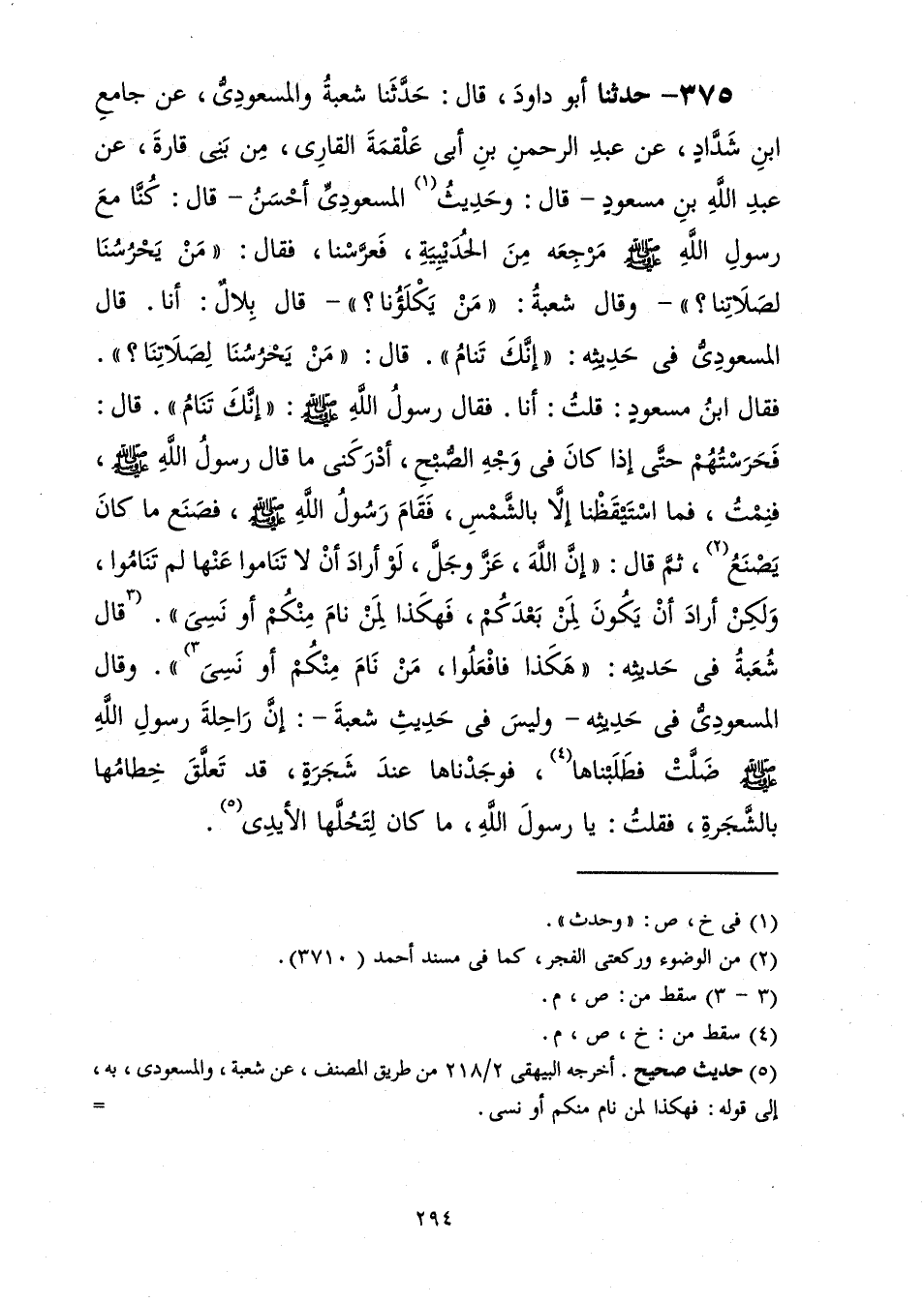 375 - حَدَّثَنَا أَبُو دَاوُدَ قَالَ: حَدَّثَنَا شُعْبَةُ، وَالْمَسْعُودِيُّ، عَنْ جَامِعِ بْنِ شَدَّادٍ، عَنْ عَبْدِ الرَّحْمَنِ بْنِ أَبِي عَلْقَمَةَ الْقَارِيِّ مِنْ بَنِي قَارَةَ، عَنْ عَبْدِ اللَّهِ بْنِ مَسْعُودٍ، قَالَ: وَحَدِيثُ الْمَسْعُودِيِّ أَحْسَنُ قَالَ: كُنَّا مَعَ رَسُولِ اللَّهِ صَلَّى اللهُ عَلَيْهِ وَسَلَّمَ مَرْجِعَهُ مِنَ الْحُدَيْبِيَةِ فَعَرَّسْنَا فَقَالَ: «مَنْ يَحْرُسُنَا لِصَلَاتِنَا؟» وَقَالَ شُعْبَةُ: «مَنْ يَكْلَؤُنَا؟» قَالَ بِلَالٌ: أَنَا قَالَ الْمَسْعُودِيُّ فِي حَدِيثِهِ: «إِنَّكَ تَنَامُ» ، قَالَ: «مَنْ يَحْرُسُنَا لِصَلَاتِنَا؟» فَقَالَ ابْنُ مَسْعُودٍ: قُلْتُ: أَنَا فَقَالَ رَسُولُ اللَّهِ صَلَّى اللهُ عَلَيْهِ وَسَلَّمَ: «إِنَّكَ تَنَامُ» ، قَالَ: فَحَرَسْتُهُمْ حَتَّى إِذَا كَانَ فِي وَجْهِ الصُّبْحِ أَدْرَكَنِي مَا قَالَ رَسُولُ اللَّهِ صَلَّى اللهُ عَلَيْهِ وَسَلَّمَ فَنِمْتُ فَمَا اسْتَيْقَظْنَا إِلَّا بِالشَّمْسِ فَقَامَ رَسُولُ اللَّهِ صَلَّى اللهُ عَلَيْهِ وَسَلَّمَ فَصَنَعَ كَمَا كَانَ يَصْنَعُ ثُمَّ قَالَ: «إِنَّ §اللَّهَ عَزَّ وَجَلَّ لَوْ أَرَادَ أَنْ لَا تَنَامُوا عَنْهَا لَمْ تَنَامُوا وَلَكِنْ أَرَادَ أَنْ يَكُونَ لِمَنْ بَعْدَكُمْ فَهَكَذَا لِمَنْ نَامَ مِنْكُمْ أَوْ نَسِيَ» ، قَالَ شُعْبَةُ فِي حَدِيثِهِ: «هَكَذَا فَافْعَلُوا مَنْ نَامَ مِنْكُمْ أَوْ نَسِيَ» ، وَقَالَ الْمَسْعُودِيُّ فِي حَدِيثِهِ - وَلَيْسَ فِي حَدِيثِ شُعْبَةَ -: إِنَّ رَاحِلَةَ رَسُولِ اللَّهِ صَلَّى اللهُ عَلَيْهِ وَسَلَّمَ ضَلَّتْ فَطَلَبْنَاهَا فَوَجَدْنَاهَا عِنْدَ شَجَرَةٍ قَدْ تَعَلَّقَ خِطَامُهَا بِالشَّجَرَةِ فَقُلْتُ: يَا رَسُولَ اللَّهِ مَا كَانَتْ لِتَحُلَّهَا الْأَيْدِي