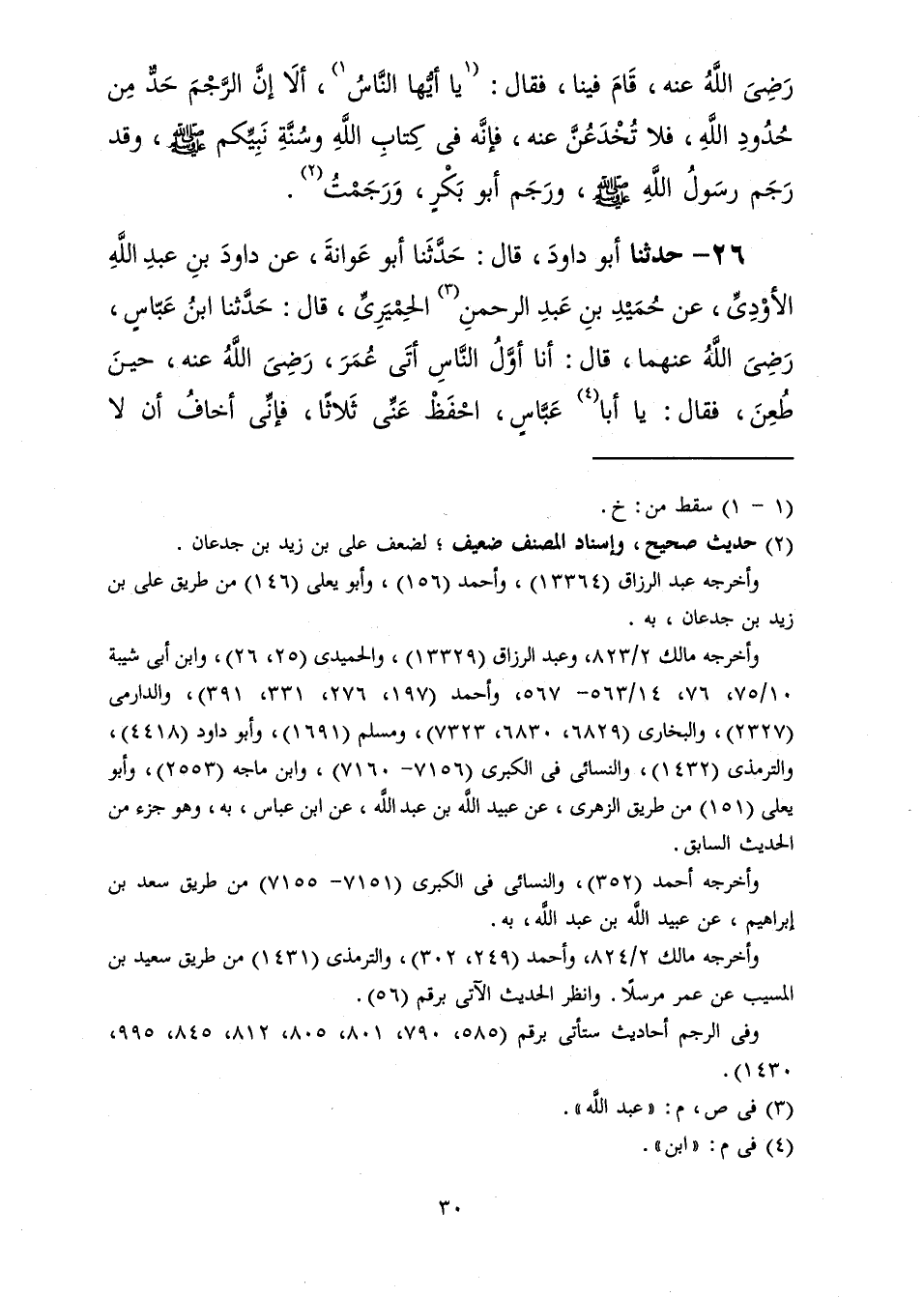 26 - حَدَّثَنَا أَبُو دَاوُدَ قَالَ: حَدَّثَنَا أَبُو عَوَانَةَ، عَنْ دَاوُدَ بْنِ عَبْدِ اللَّهِ الْأَوْدِيِّ، عَنْ حُمَيْدِ بْنِ عَبْدِ الرَّحْمَنِ الْحِمْيَرِيِّ، قَالَ: حَدَّثَنَا ابْنُ عَبَّاسٍ رَضِيَ اللَّهُ عَنْهُمَا، قَالَ: " أَنَا أَوَّلُ النَّاسِ أَتَى عُمَرَ رَضِيَ اللَّهُ عَنْهُ حِينَ طُعِنَ فَقَالَ: " يَا أَبَا عَبَّاسٍ احْفَظْ عَنِّي ثَلَاثًا فَإِنِّي أَخَافُ أَنْ لَا -[31]- يُدْرِكَنِي النَّاسُ، إِنِّي لَمْ أَقْضِ فِي الْكَلَالَةِ وَلَمْ أَسْتَخْلِفْ عَلَى النَّاسِ خَلِيفَةً، وَكُلُّ مَمْلُوكٍ لِي عَتِيقٌ فَقِيلَ لَهُ: اسْتَخْلِفْ قَالَ: أَيَّ ذَلِكَ فَعَلْتُ فَقَدْ فَعَلَهُ مَنْ هُوَ خَيْرٌ مِنِّي §إِنْ أَسْتَخْلِفْ فَقَدِ اسْتَخْلَفَ مَنْ هُوَ خَيْرٌ مِنِّي وَإِنْ أَدَعِ النَّاسَ إِلَى أَمْرِهِمْ فَقَدْ تَرَكَهُ رَسُولُ اللَّهِ صَلَّى اللهُ عَلَيْهِ وَسَلَّمَ قُلْتُ: أَبْشِرْ بِالْجَنَّةِ يَا أَمِيرَ الْمُؤْمِنِينَ صَحِبْتَ رَسُولَ اللَّهِ صَلَّى اللهُ عَلَيْهِ وَسَلَّمَ فَأطَلْتَ صُحْبَتَهُ، ثُمَّ وَلِيتَ فَعَدَلْتَ وَأَدَّيْتَ الْأَمَانَةَ، فَقَالَ عُمَرُ رَضِيَ اللَّهُ عَنْهُ: أَمَّا تُبْشيِرُكَ إِيَّايَ بِالْجَنَّةِ فَوَاللَّهِ الَّذِي لَا إِلَهَ إِلَّا هُوَ لَوْ أَنَّ لِيَ مَا بَيْنَ السَّمَاءِ وَالْأَرْضِ لَافْتَدَيْتُ بِهِ مِمَّا هُوَ أَمَامِي قَبْلَ أَنْ أَعْلَمَ الْخَبَرَ، وَأَمَّا مَا ذَكَرْتَ مِنْ أَمْرِ الْمُسْلِمِينَ فَوَاللَّهِ لَوَدِدْتُ أَنِّي نَجَوْتُ مِنْهَا كَفَافًا لَا عَلَيَّ وَلَا لِيَ، وَأَمَّا مَا ذَكَرْتَ مِنْ صُحْبَةِ رَسُولِ اللَّهِ صَلَّى اللهُ عَلَيْهِ وَسَلَّمَ فَذَاكَ "