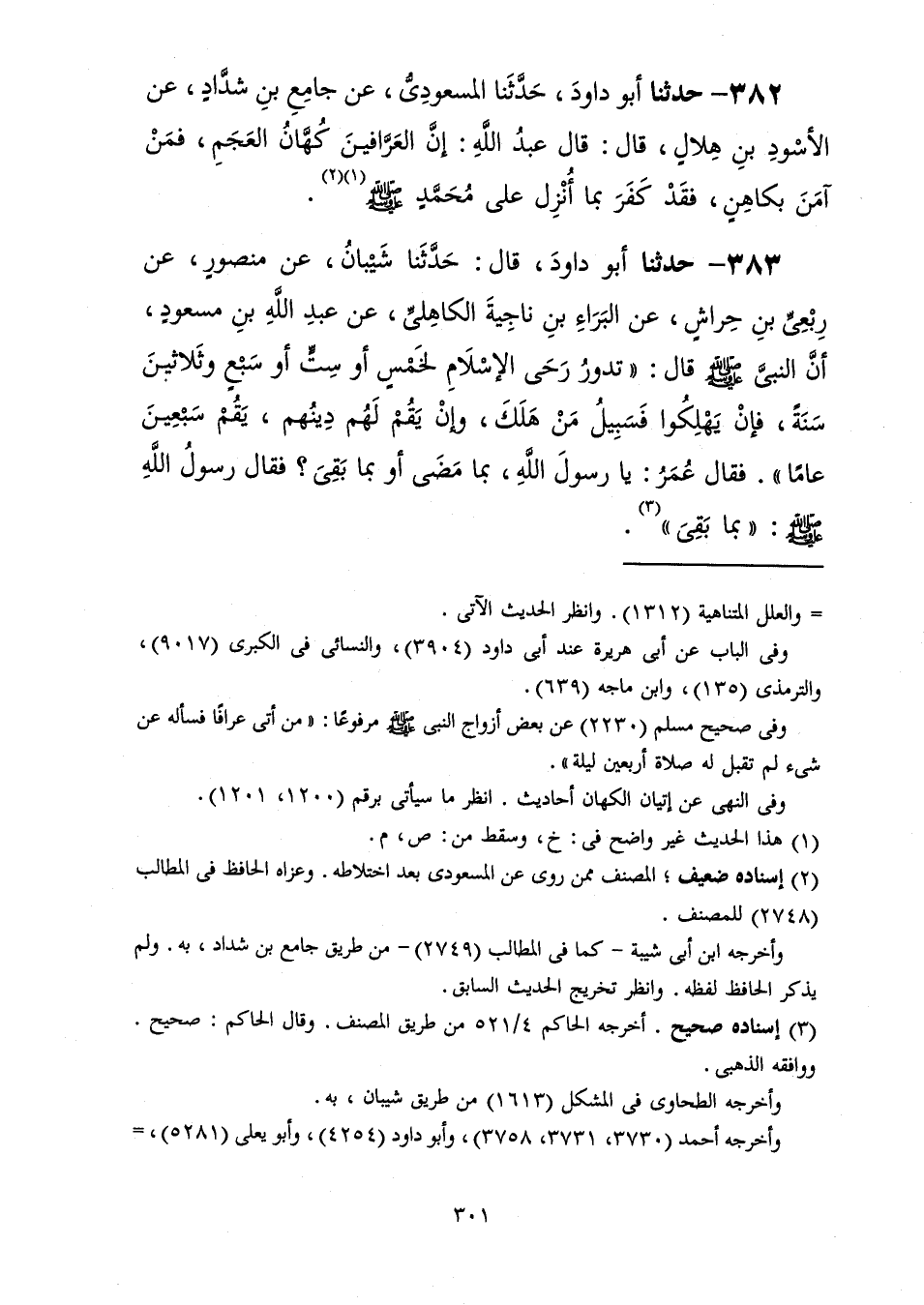 382 - حَدَّثَنَا أَبُو دَاوُدَ قَالَ: حَدَّثَنَا الْمَسْعُودِيُّ عَنْ جَامِعِ بْنِ شَدَّادٍ عَنِ الْأَسْوَدِ بْنِ هِلَالٍ قَالَ: قَالَ عَبْدُ اللَّهِ: إِنَّ §الْعَرَّافِينَ كُهَّانُ الْعَجَمِ فَمَنْ آمَنَ بِكَاهِنٍ فَقَدْ كَفَرَ بِمَا أُنْزِلَ عَلَى مُحَمَّدٍ صَلَّى اللهُ عَلَيْهِ وَسَلَّمَ "