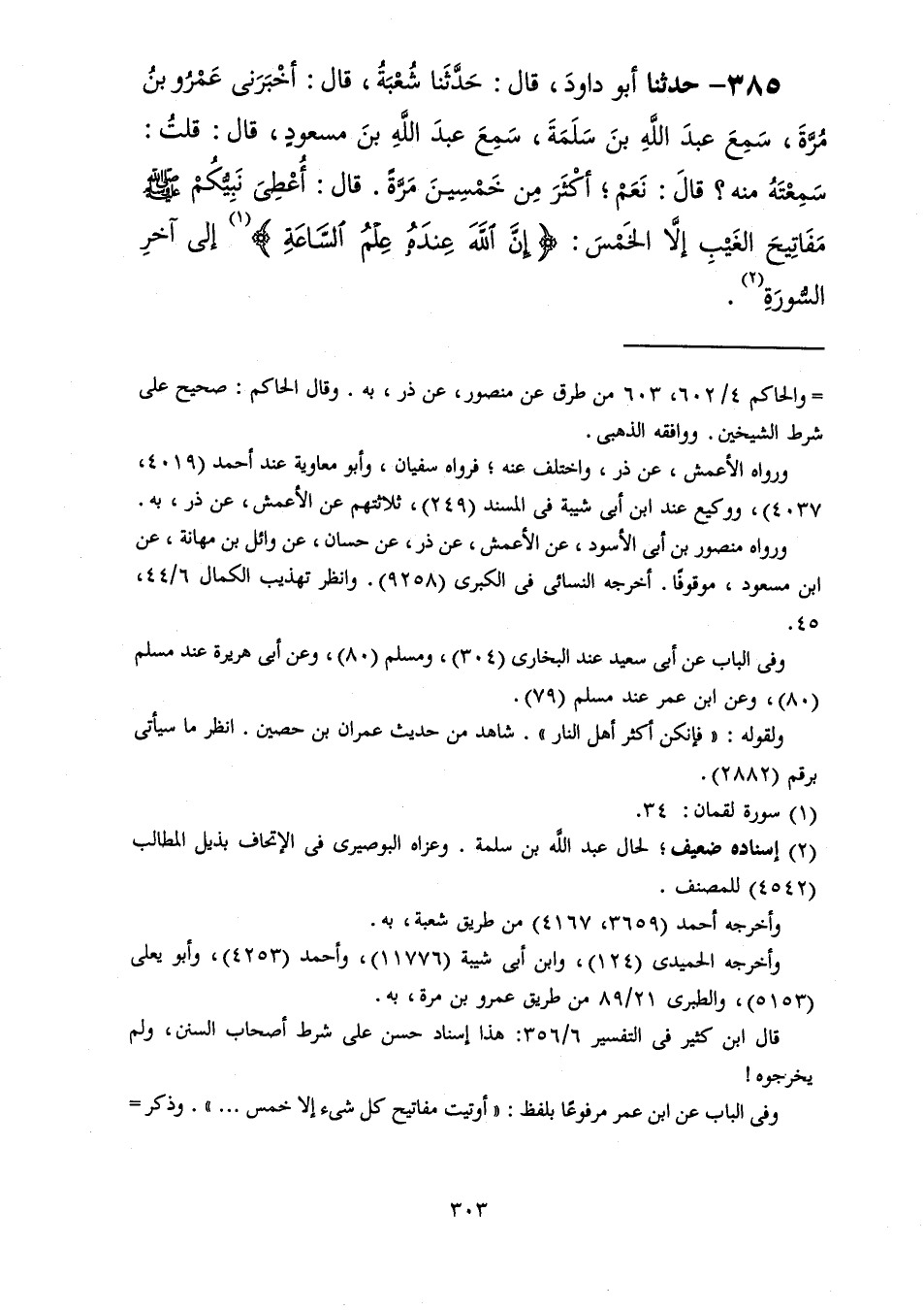 385 - حَدَّثَنَا أَبُو دَاوُدَ قَالَ: حَدَّثَنَا شُعْبَةُ، قَالَ: أَخْبَرَنِي عَمْرُو بْنُ مُرَّةَ، سَمِعَ عَبْدَ اللَّهِ بْنَ سَلَمَةَ، سَمِعَ عَبْدَ اللَّهِ بْنَ مَسْعُودٍ، قَالَ: قُلْتُ: سَمِعْتَهُ مِنْهُ؟ قَالَ: نَعَمْ أَكْثَرَ مِنْ خَمْسِينَ مَرَّةً قَالَ: " §أُعْطِيَ نَبِيُّكُمْ صَلَّى اللهُ عَلَيْهِ وَسَلَّمَ مَفَاتِيحَ الْغَيْبِ إِلَّا الْخَمْسَ {إِنَّ اللَّهَ عِنْدَهُ عِلْمُ السَّاعَةِ} [لقمان: 34] إِلَى آخِرِ السُّورَةِ "
