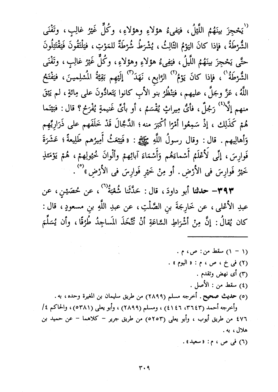 393 - حَدَّثَنَا أَبُو دَاوُدَ قَالَ: حَدَّثَنَا شُعْبَةُ، عَنْ حُصَيْنٍ، عَنْ عَبْدِ الْأَعْلَى، عَنْ خَارِجَةَ بْنِ الصَّلْتِ، عَنْ عَبْدِ اللَّهِ بْنِ مَسْعُودٍ، قَالَ: كَانَ يُقَالُ: " إِنَّ §مِنْ أَشْرَاطِ السَّاعَةِ أَنْ تُتَّخَذَ الْمَسَاجِدُ طُرُقًا وَأَنْ يُسَلِّمَ -[310]- الرَّجُلُ عَلَى الرَّجُلِ بِالْمَعْرِفَةِ وَأَنْ يَتَّجِرَ الرَّجُلُ وَامْرَأَتُهُ جَمِيعًا وَأَنْ تَغْلُوَ مُهُورُ النِّسَاءِ، وَالْخَيْلُ، ثُمَّ تَرْخُصَ فَلَا تَغْلُو إِلَى يَوْمِ الْقِيَامَةِ قَالَ أَبُو دَاوُدَ: قَالَ شُعْبَةُ: لَمْ نَسْمَعْ عَنِ ابْنِ مَسْعُودٍ كَانَ يُقَالُ إِلَّا هَذَا وَرَوَى الثَّوْرِيُّ هَذَا الْحَدِيثَ، عَنْ حُصَيْنٍ عَنْ عَبْدِ الْأَعْلَى، عَنِ الصَّلْتِ قَالَ: دَخَلْتُ مَعَ عَبْدِ اللَّهِ الْمَسْجِدَ فَرَكَعَ فَمَرَّ عَلَيْهِ رَجُلٌ وَهُوَ رَاكِعٌ فَسَلَّمَ عَلَيْهِ قَالَ عَبْدُ اللَّهِ: صَدَقَ اللَّهُ وَرَسُولُهُ فَلَمَّا انْصَرَفَ قَالَ: كَانَ يُقَالُ